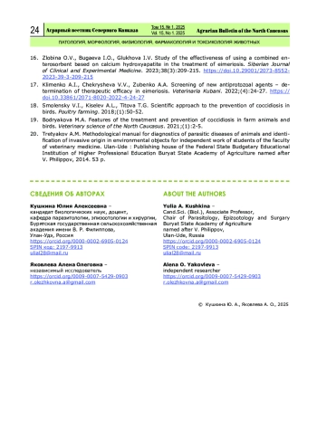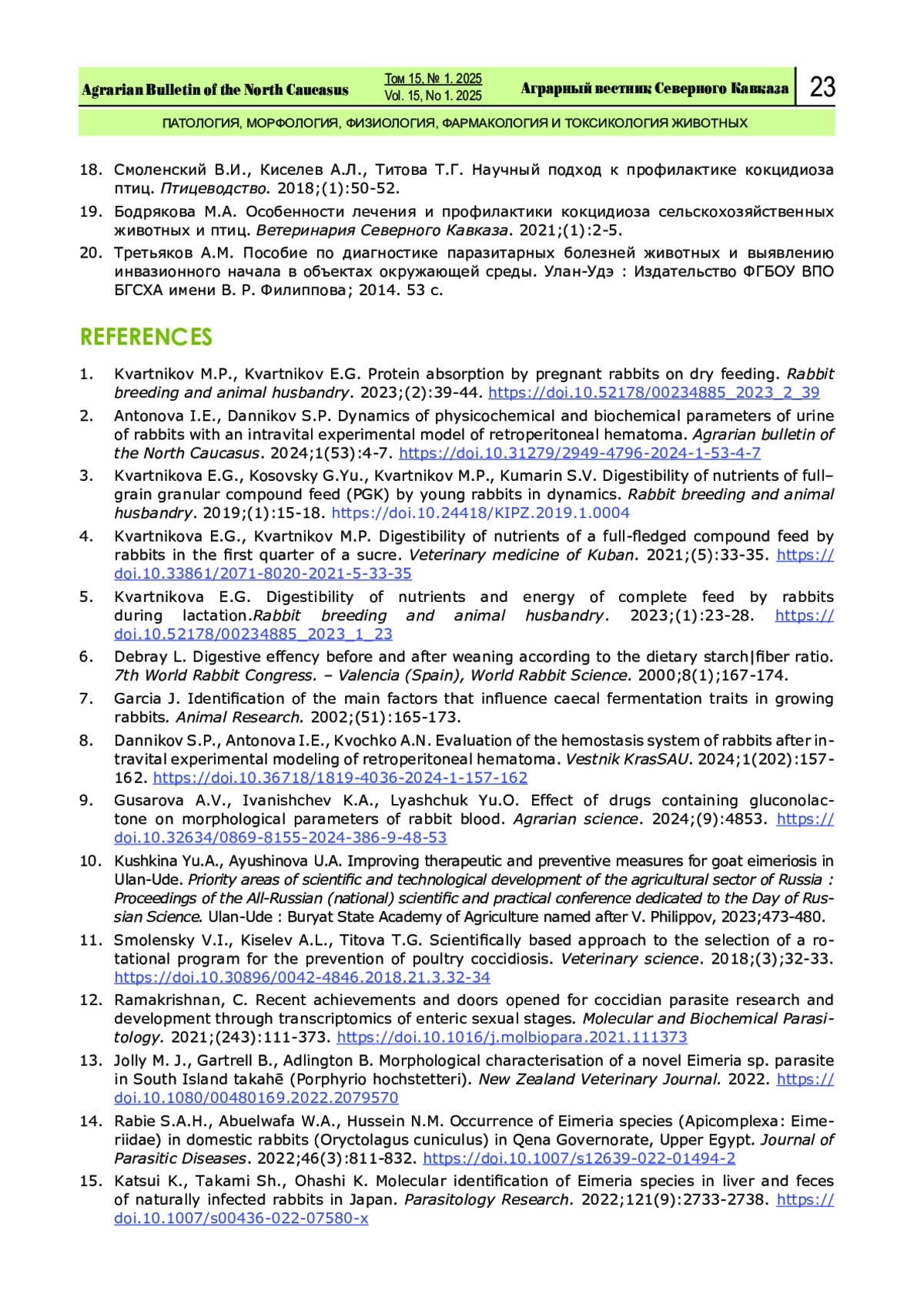 19. Бодрякова, М.А. Особенности лечения и профилактики кокцидиоза сельскохозяйственных животных и птиц. Ветеринария Северного Кавказа. 2021;(1): 2-5.