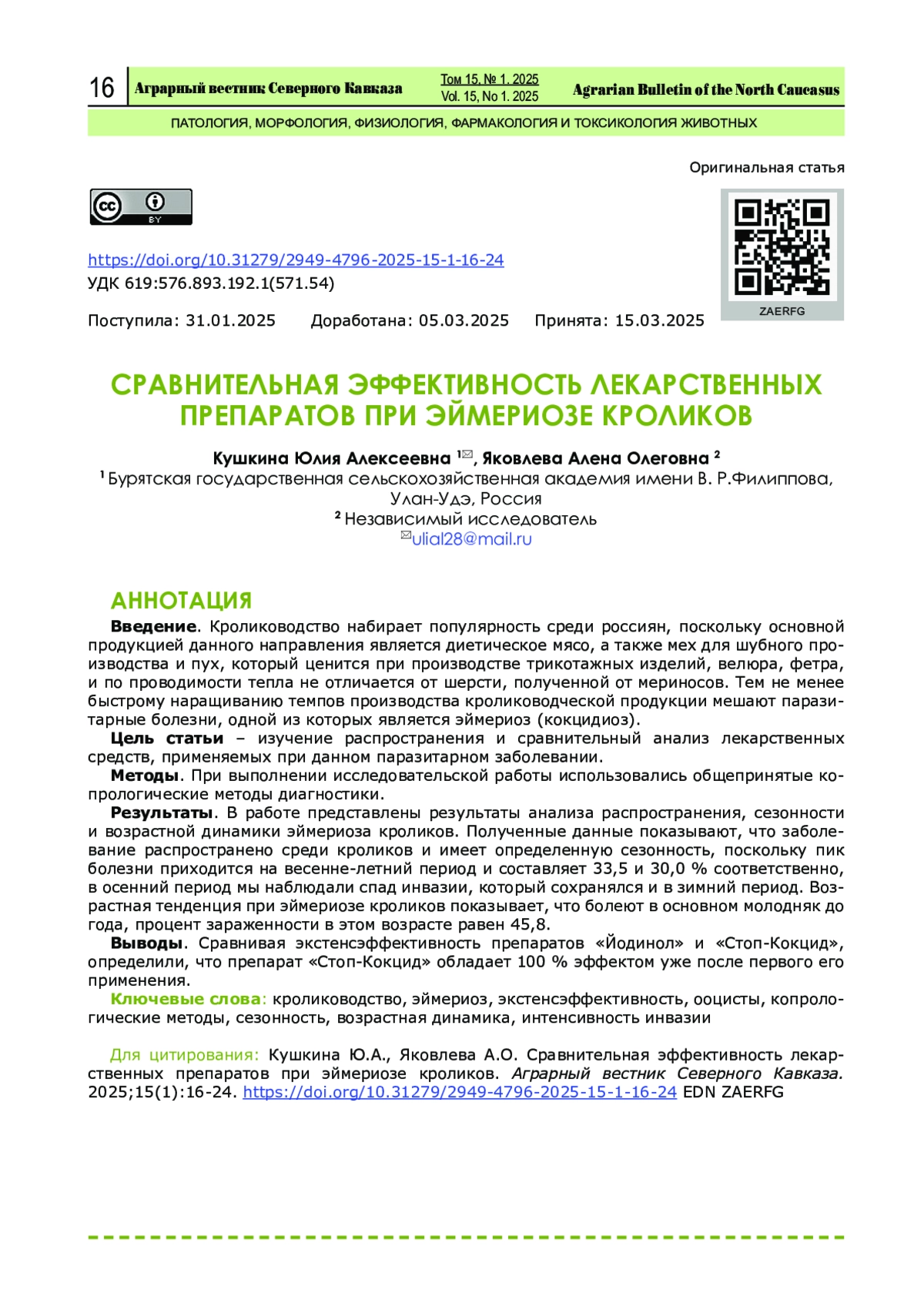 10. Кушкина Ю.А., Аюшинова У.А. Совершенствование лечебно-профилактических мероприятий при эймериозе коз в Г. Улан-Удэ. Приоритетные направления научно-технологического развития аграрного сектора России: Материалы всероссийской (национальной) научно-практической конференции, посвященной Дню российской науки, Улан-Удэ, Бурятская государственная сельскохозяйственная академия имени В.Р. Филиппова. 2023; 473-480.