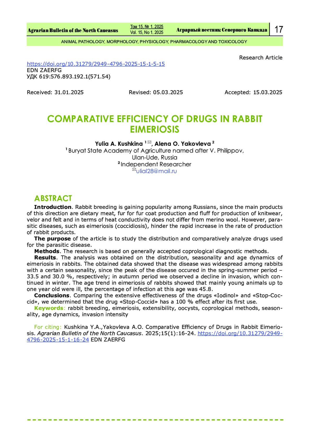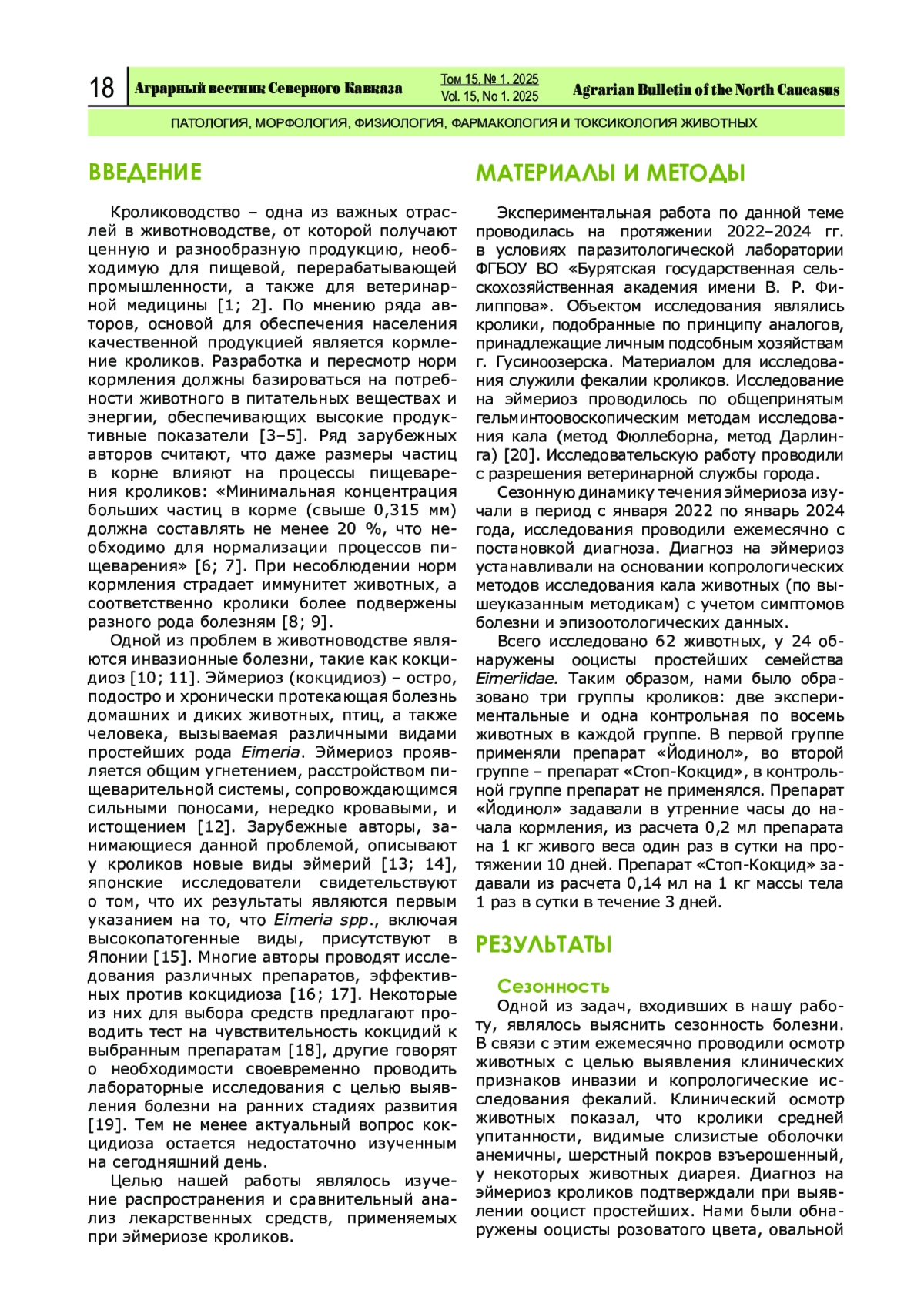 Введение. Кролиководство набирает популярность среди россиян, поскольку основной продукцией данного направления является диетическое мясо, а также мех для шубного производства и пух, который ценится при производстве трикотажных изделий, велюра, фетра, и по проводимости тепла не отличается от шерсти, полученной от мериносов. Тем не менее быстрому наращиванию темпов производства кролиководческой продукции мешают паразитарные болезни, одной из которых является эймериоз (кокцидиоз).