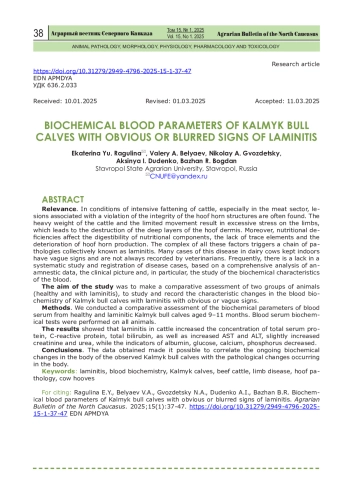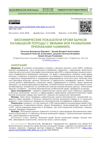 Цель исследования – провести сравнительную оценку двух групп животных (здоровые и больные ламинитом), изучить и зафиксировать характерные изменения биохимии крови бычков калмыцкой породы при ламините с явными или размытыми признаками.