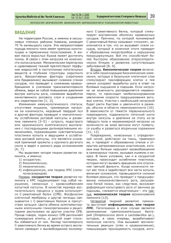 Введение. В условиях интенсивного откорма у крупного рогатого скота (КРС), особенно мясного направления, часто встречаются поражения, связанные с нарушением целостности структур копытного рога. Благодаря значительному весу КРС и ограниченному моциону конечности подвергаются чрезмерным нагрузкам, что ведет к разрушению глубоких слоев дермы копытец, а недочеты в рационе сказываются на усвояемости компонентов питания, приводят к недостатку микроэлементов и ухудшению продуцирования копытного рога. Комплекс всех этих факторов запускает цепочку патологий, в совокупности называемую ламинит. Многие случаи данного заболевания у молочных коров, содержащихся в стойлах, имеют размытые признаки и не всегда фиксируются врачами, систематическое изучение и регистрация случаев заболевания, основанные на комплексном анализе анамнестических данных, клинической картине и особенно – изучении биохимических особенностей крови, проводятся не всегда.