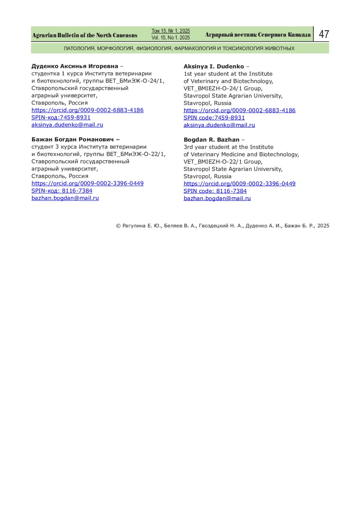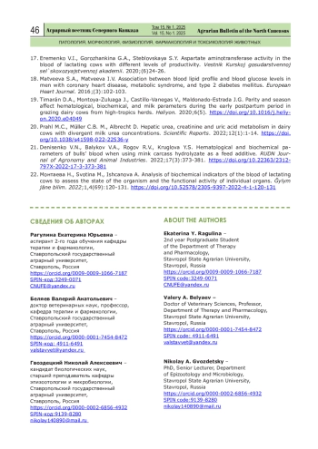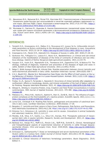21. Денисенко В.Н., Балыков В.А., Рогов Р.В., Круглова Ю.С. Гематологические и биохимические показатели крови бычков при использовании в качестве кормовой добавки гидролизата тушек норок. Вестник РУДН 2022;17(3):373-381. DOI: 10.22363/2312-797X-2022-17-3-373-381