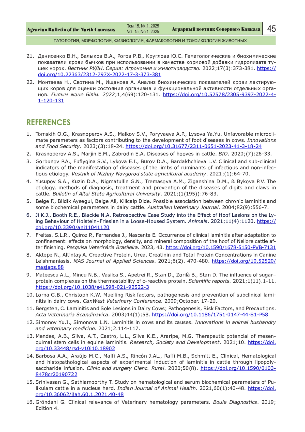 22. Монтаева Н., Свотина М., Ищанова А. Анализ биохимических показателей крови лактирующих коров для оценки состояния организма и функциональной активности отдельных органов Ғылым және Бiлiм. 2022;1,4(69):120-131. DOI: 10.52578/2305-9397-2022-4-1-120-131