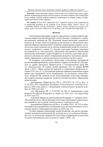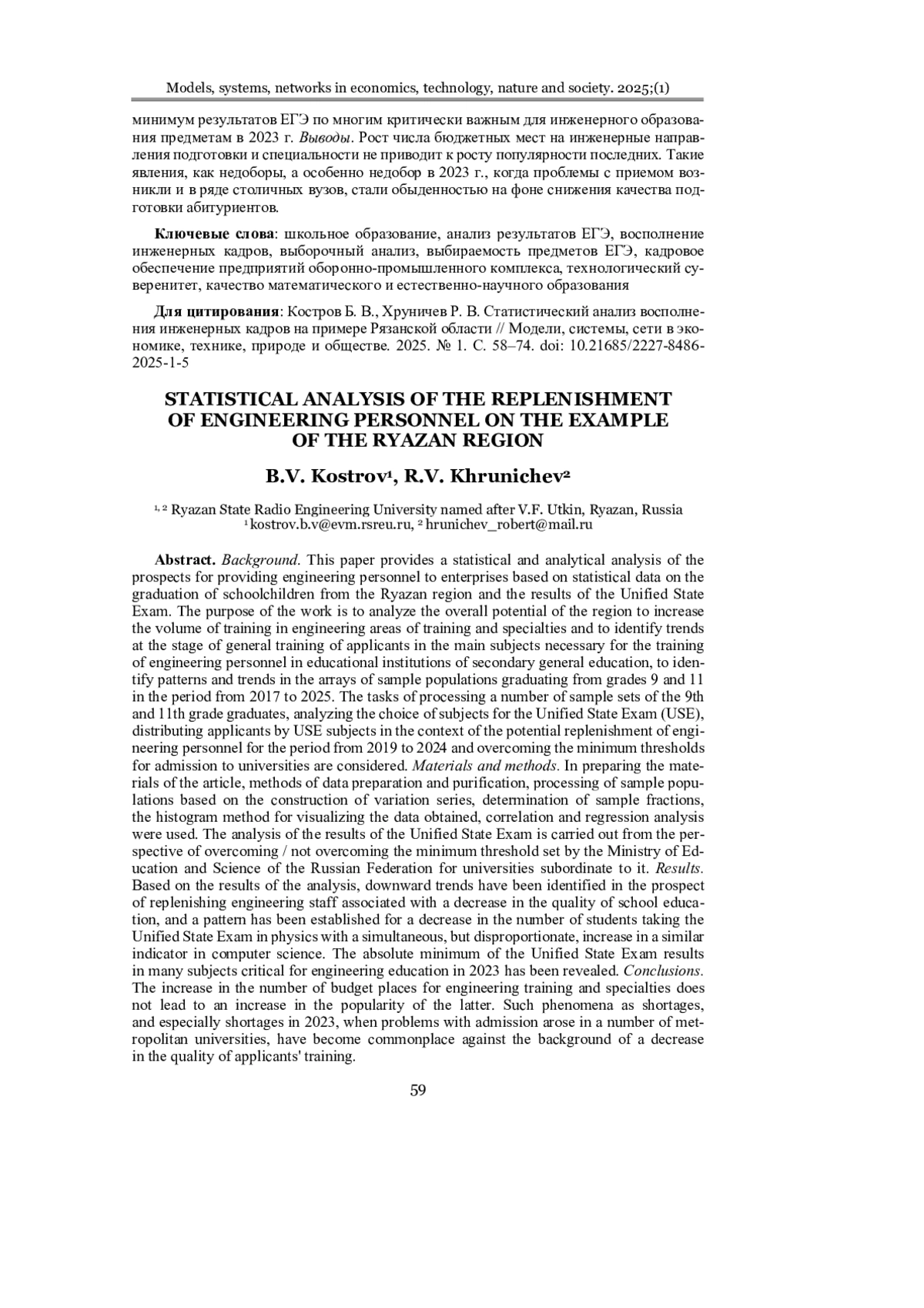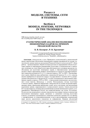 Актуальность и цели. Приводится статистический и аналитический анализ перспективы обеспечения инженерными кадрами предприятий на основе статистических данных выпуска школьников Рязанской области и результатов ЕГЭ. Цель работы - проанализировать общий потенциал региона по наращиванию объема подготовки кадров по инженерным направлениям подготовки и специальностям и определить тенденции на этапе общей подготовки абитуриентов по основным предметам, необходимым для подготовки инженерных кадров, в образовательных организациях среднего общего образования, выявить закономерности и тренды по массивам выборочных совокупностей выпуска 9-х и 11-х классов в период с 2017 по 2025 г. Рассматриваются задачи обработки ряда выборочных совокупностей выпуска 9-х и 11-х классов, анализа выбираемости предметов единого государственного экзамена (ЕГЭ), распределения абитуриентов по предметам ЕГЭ в срезе потенциального восполнения инженерных кадров за период с 2019 по 2024 г. и преодоления минимальных для поступления в вузы порогов.