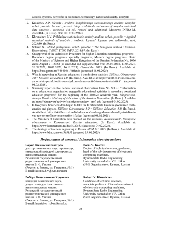 12. Кулаичев А. П. Методы и средства комплексного статистического анализа данных: учеб. пособие. 5-е изд., перераб. и доп. М.: ИНФРА-М, 2025. 484 с. (Высшее образование). DOI: 10.12737/25093