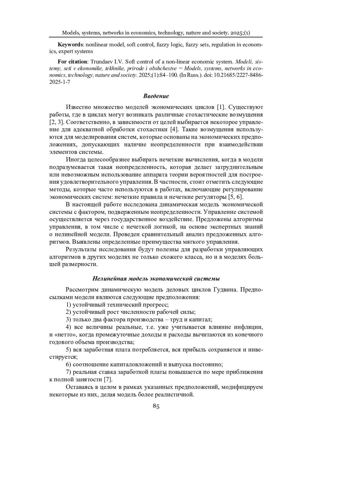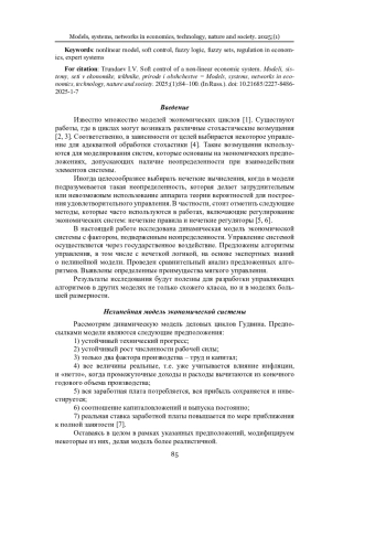 Материалы и методы. Экономическая система описывается нелинейной моделью, включающей случайный фактор и управляющее воздействие со стороны государства. В рамках этой модели построены алгоритмы управления на основе экспертных знаний, направленные на обеспечение сбалансированного и устойчивого развития.