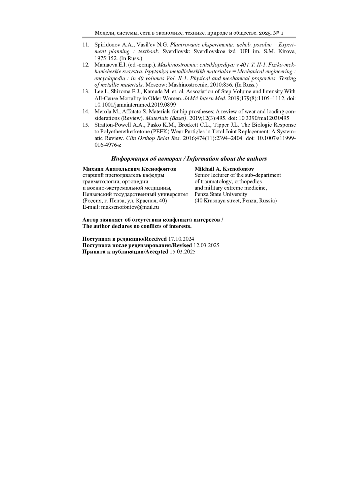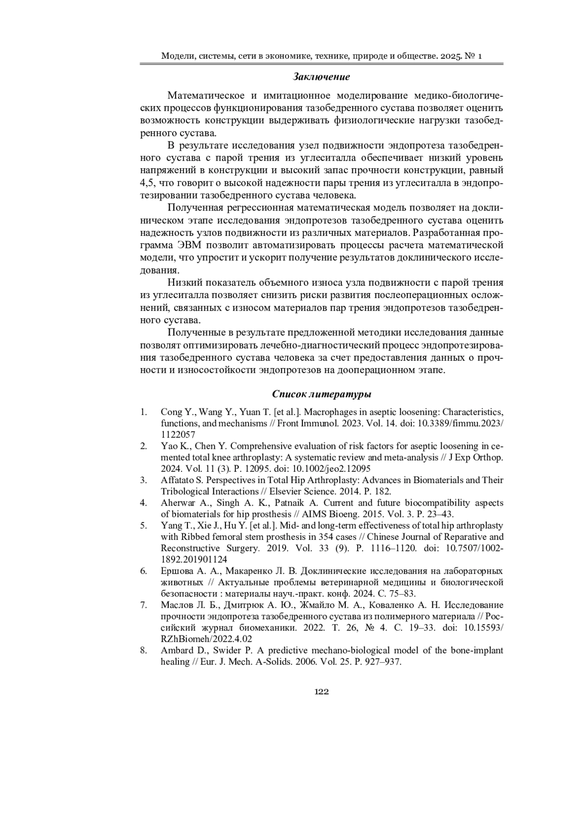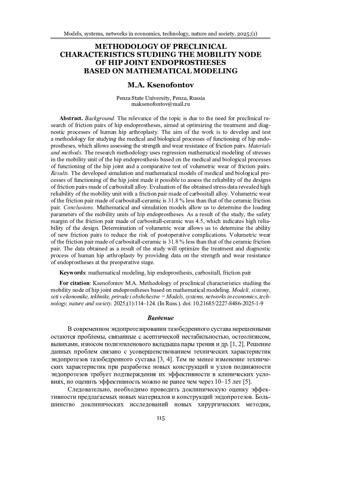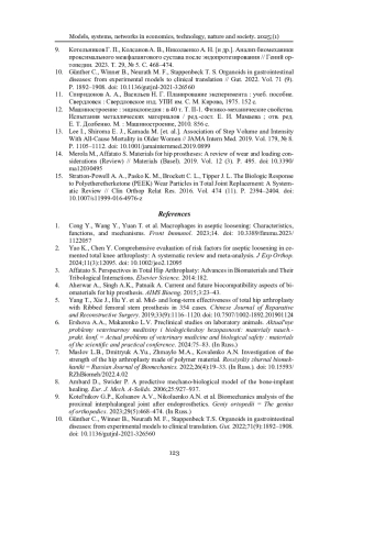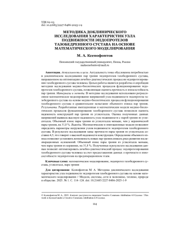 Выводы. Математические и имитационные модели позволяют определять параметры нагружения узлов подвижности эндопротезов тазобедренного сустава. В результате исследования запас прочности пары трения из углеситалла составил 4,5, что говорит о высокой надежности конструкции. Определение объемного износа позволяет установить возможность новых пар трения снижать риск развития послеоперационных осложнений. Объемный износ пары трения из углеситалла меньше, чем пары трения из керамики, на 31,8 %. Полученные в результате исследования данные позволят оптимизировать лечебно-диагностический процесс эндопротезирования тазобедренного сустава человека за счет предоставления данных о прочности и износостойкости эндопротезов на предоперационном этапе.