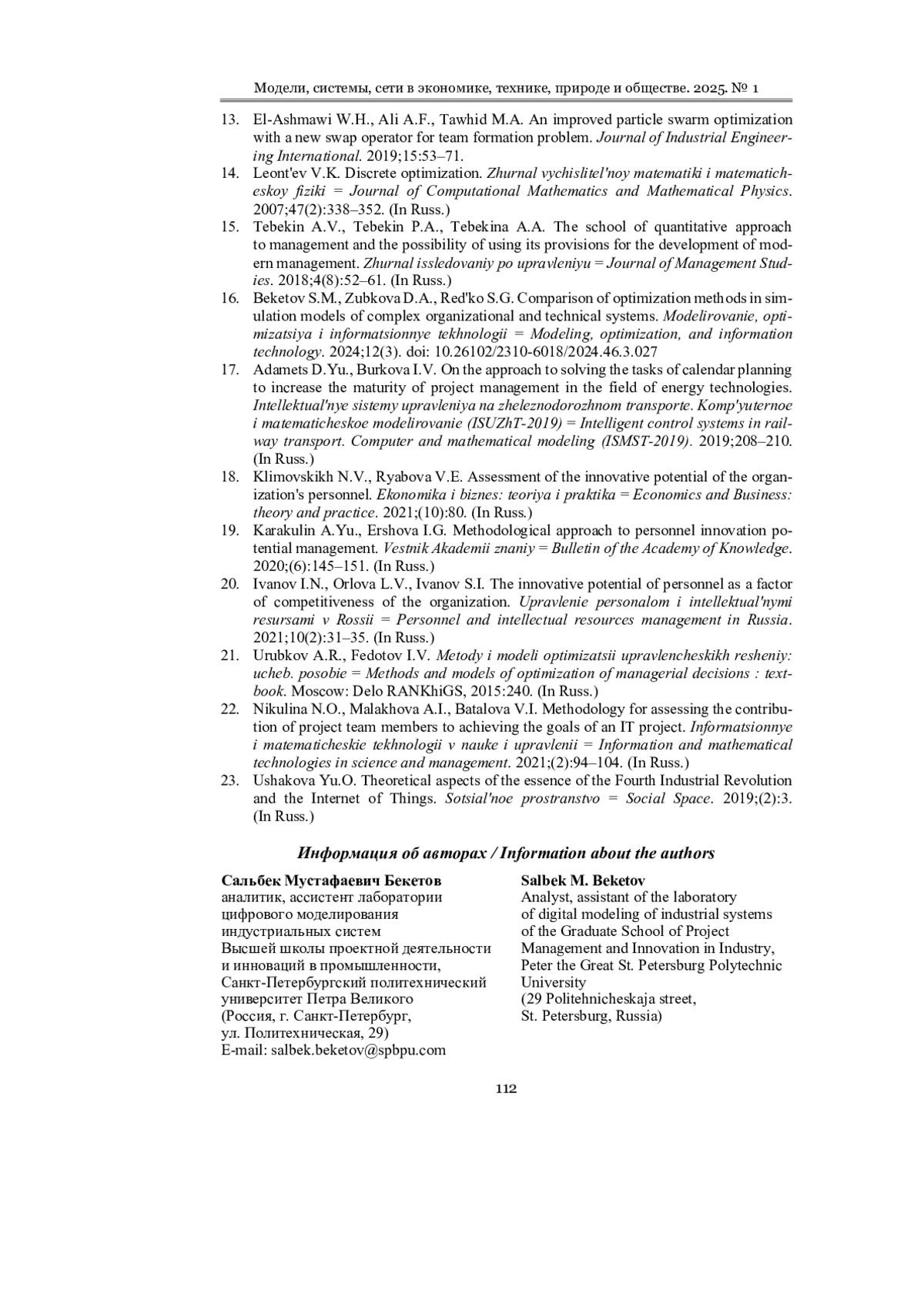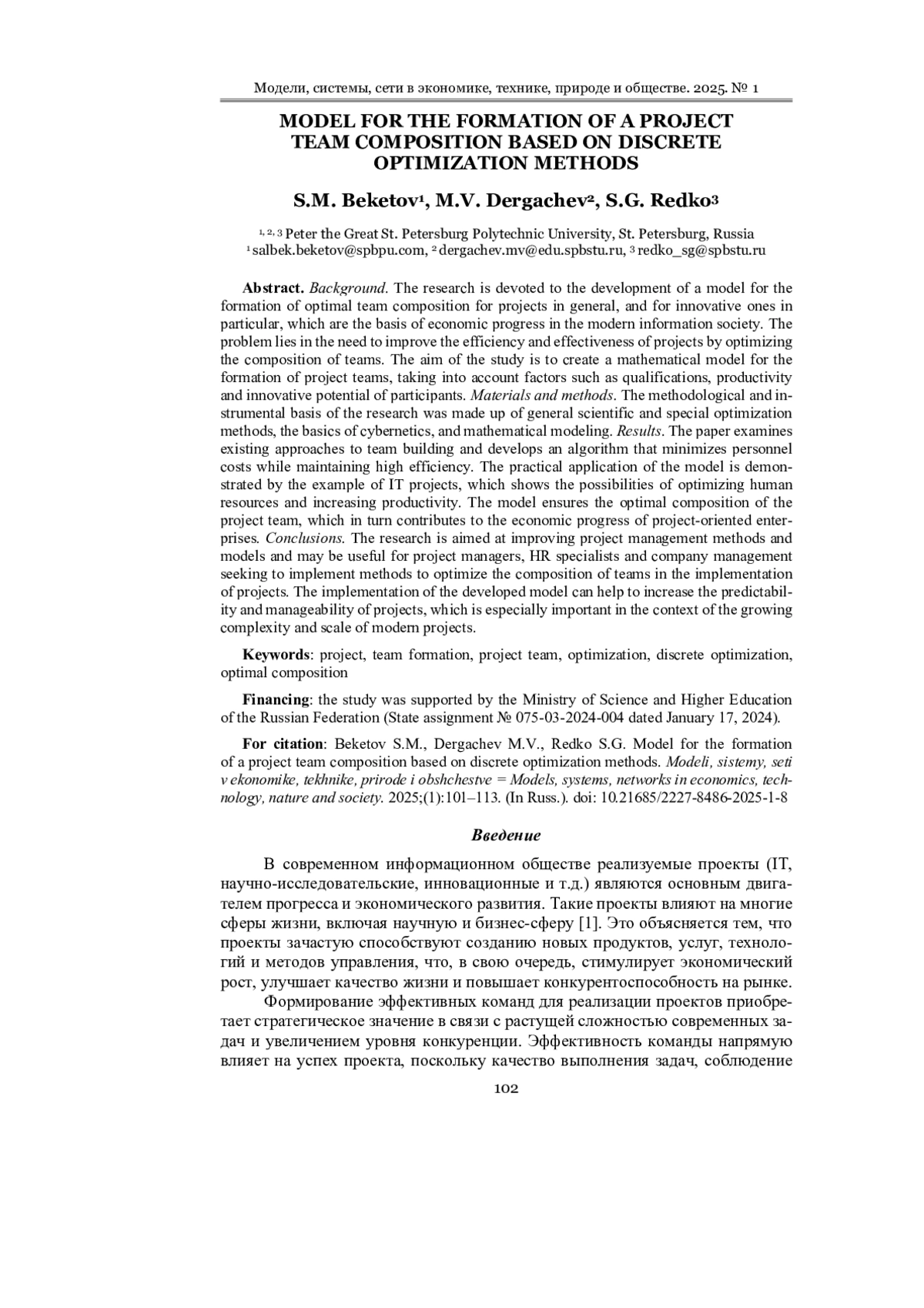 1. Beketov S. M., Pospelov K. N., Redko S. G. A human capital simulation model in innovation projects // Control Sciences. 2024. № 3. P. 16-25. DOI: 10.25728/cs.2024.3.2