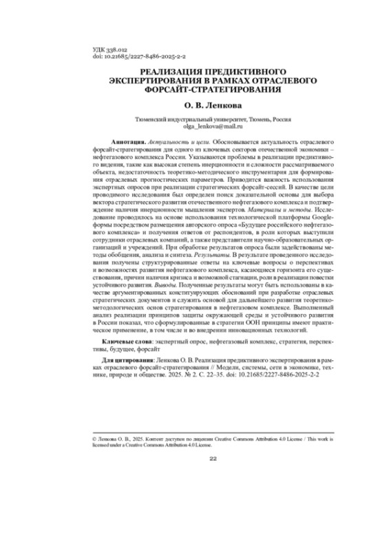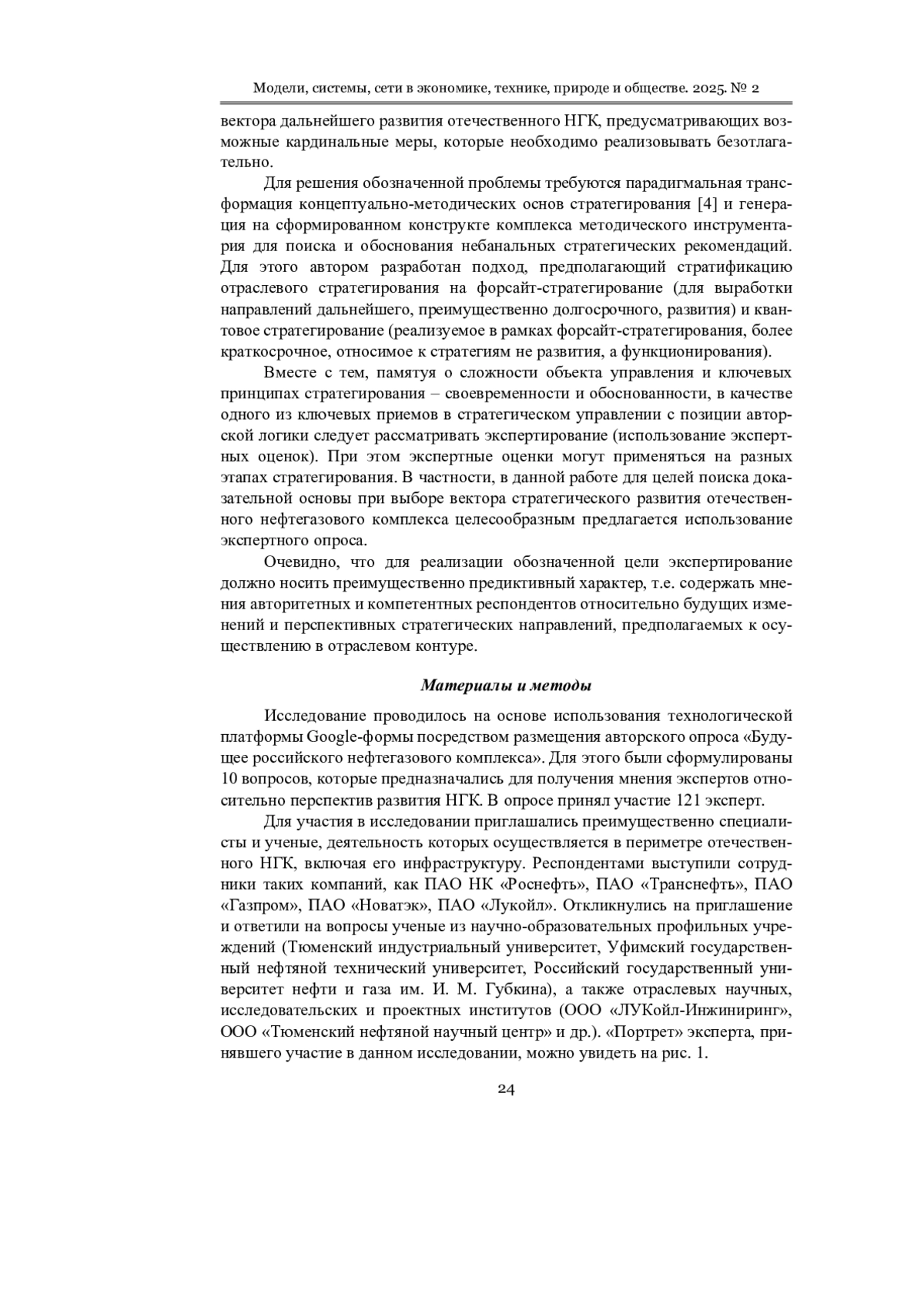 Материалы и методы. Исследование проводилось на основе использования технологической платформы Google-формы посредством размещения авторского опроса «Будущее российского нефтегазового комплекса» и получения ответов от респондентов, в роли которых выступили сотрудники отраслевых компаний, а также представители научно-образовательных организаций и учреждений. При обработке результатов опроса были задействованы методы обобщения, анализа и синтеза.