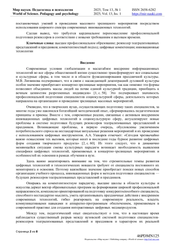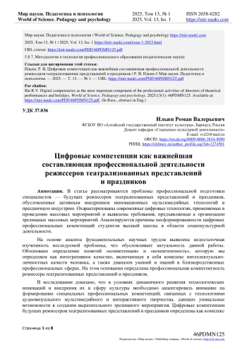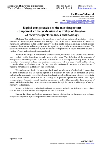 В статье рассматриваются проблемы профессиональной подготовки специалистов - будущих режиссеров театрализованных представлений и праздников, обусловленные активным внедрением инновационных мультимедийных технологий в праздничную индустрию. Охарактеризованы современные цифровые технологии, применяемые в проведении массовых мероприятий и выявлены требования, предъявляемые к организации зрелищных массовых мероприятий. Анализируются причины несформированности цифровых профессиональных компетенций студентов высшей школы в области социокультурной деятельности. На основе анализа фундаментальных научных трудов выявлена недостаточная изученность исследуемой проблемы, что обусловливает актуальность данной работы. Обосновано определение понятий «компетенция» и «компетентность», которую мы определяем как интегративное качество, включающее в себя комплекс интеллектуально-личностных качеств человека, а также диапазон умений и знаний в близкородственных профессиональных сферах. На этом основании определена профессиональная компетентность режиссера театрализованных представлений и праздников. В исследовании доказано, что в условиях динамичного развития технологических инноваций и внедрения их в сферу культуры необходимо акцентировать внимание на формирование специальных профессиональных компетенций, связанных с технологиями аудиовизуального мультимедийного и интерактивного творчества, дающих уникальные возможности в создании выразительного зрелищного мероприятия. Цифровые компетенции будущих режиссеров театрализованных представлений и праздников определены как комплекс постановочных умений в проведении массового зрелищного мероприятия посредством использования широкого спектра современных инновационных технологий. Сделан вывод, что требуется кардинальное переосмысление профессиональной подготовки режиссеров в соответствии с новыми требованиям и вызовам времени.