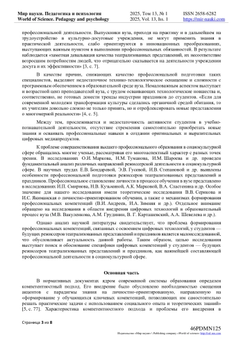 Задачи исследования: рассмотреть теоретические основы профессионального воспитания; провести онлайн-опрос студентов о влиянии цифровых технологий на учебный и воспитательный процессы; провести анализ полученных результатов о влиянии цифровых технологий на процесс профессионального воспитания в вузе. Статья освещает проблемы, с которыми сталкиваются студенты в процессе обучения, такие как сложности в управлении временем, недостаток личного контакта и технические барьеры. В связи с этим акцентируется внимание на необходимости использования цифровых технологий для повышения вовлеченности студентов и их личной ответственности за результаты обучения. В исследовании приводится анализ онлайн-опроса студентов, который показал, что большинство студентов позитивно оценивают влияние цифровых технологий на их обучение и профессиональную готовность. Студенты отмечают, что поддержка со стороны университета, использование цифровых ресурсов и инновационных методов преподавания значительно увеличивают их мотивацию и удовлетворенность учебным процессом. В заключении авторы выделяют важность профессионального воспитания как системы отношений между личностью и профессией, утверждая, что успешное формирование профессиональной идентичности возможно только через интеграцию новых подходов и технологий. При этом, образовательные учреждения должны активно адаптироваться к вызовам времени, создавая условия для качественного образования в сфере, где постоянные изменения становятся нормой.