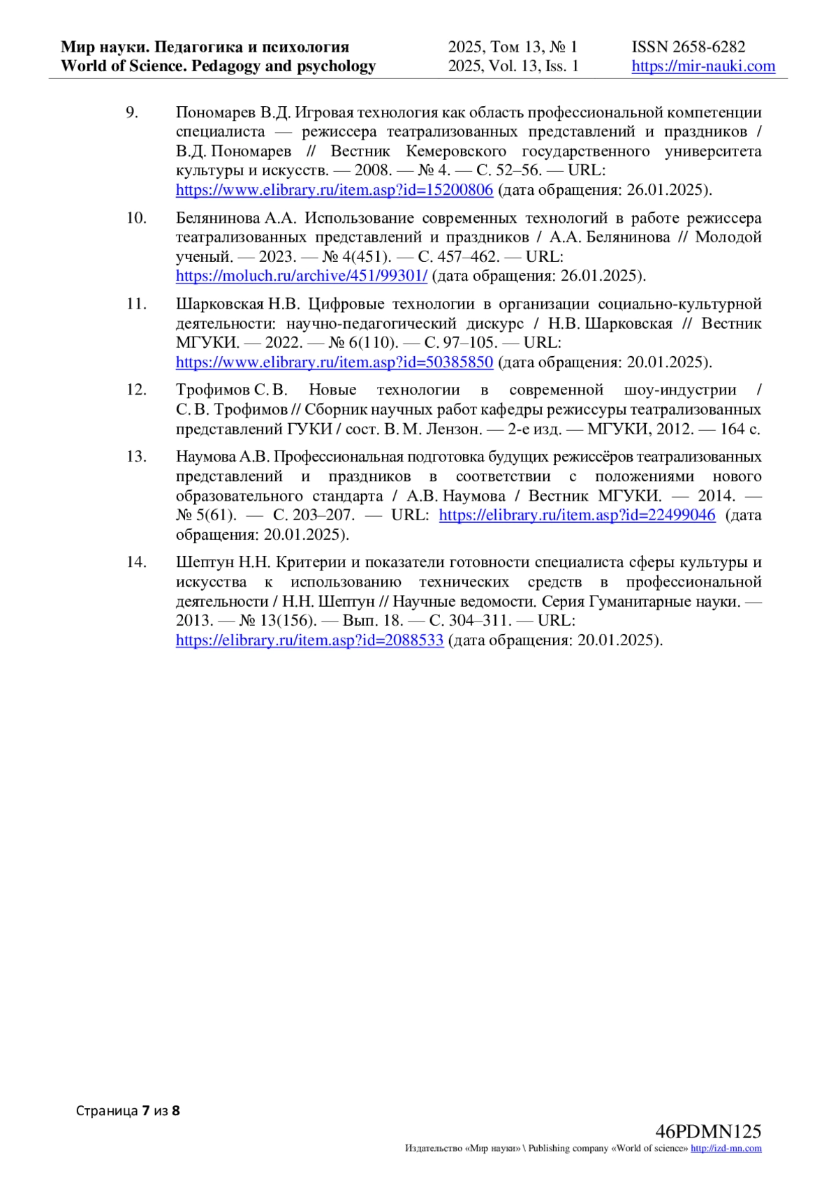 14. Шептун Н.Н. Критерии и показатели готовности специалиста сферы культуры и искусства к использованию технических средств в профессиональной деятельности / Н.Н. Шептун // Научные ведомости. Серия Гуманитарные науки. - 2013. - № 13(156). - Вып. 18. - С. 304-311. - URL: https://elibrary.ru/item.asp?id=2088533 (дата обращения: 20.01.2025).