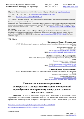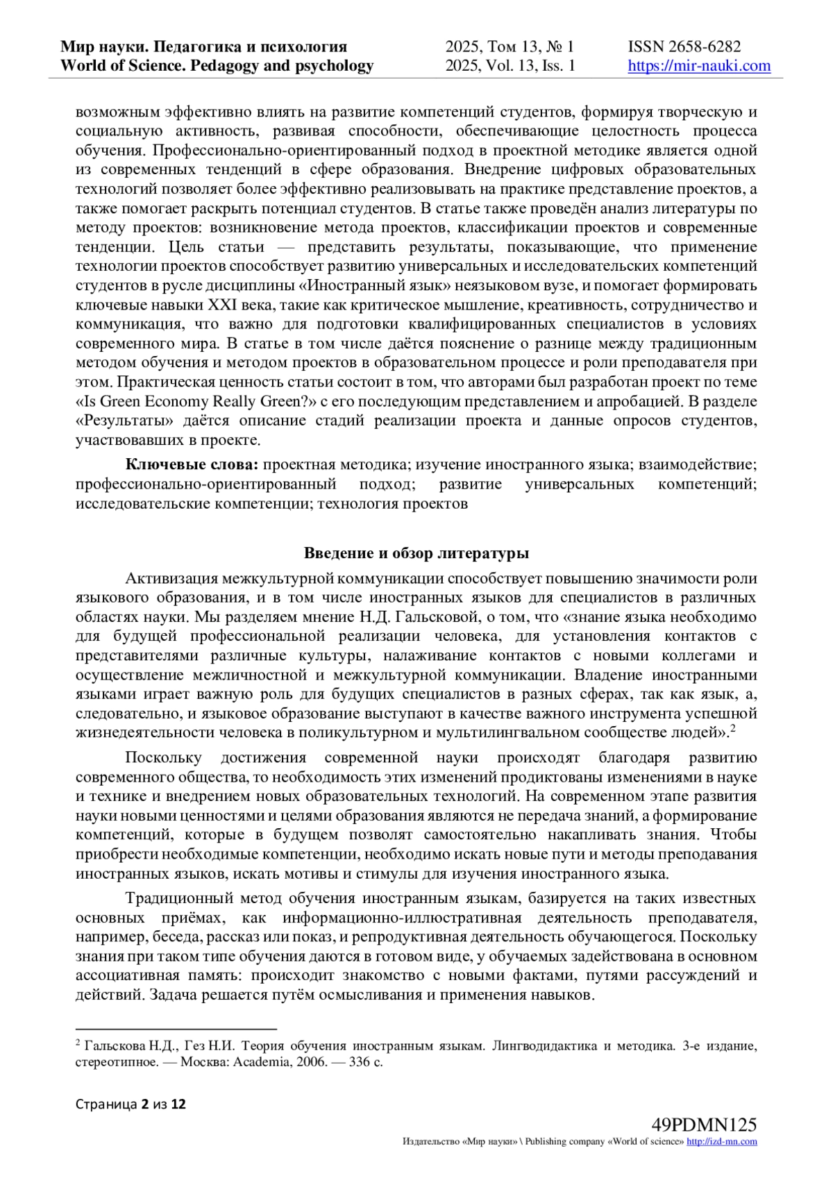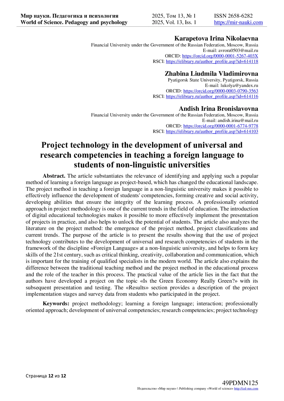 Цель статьи - представить результаты, показывающие, что применение технологии проектов способствует развитию универсальных и исследовательских компетенций студентов в русле дисциплины «Иностранный язык» неязыковом вузе, и помогает формировать ключевые навыки XXI века, такие как критическое мышление, креативность, сотрудничество и коммуникация, что важно для подготовки квалифицированных специалистов в условиях современного мира. В статье в том числе даётся пояснение о разнице между традиционным методом обучения и методом проектов в образовательном процессе и роли преподавателя при этом. Практическая ценность статьи состоит в том, что авторами был разработан проект по теме «Is Green Economy Really Green?» с его последующим представлением и апробацией. В разделе «Результаты» даётся описание стадий реализации проекта и данные опросов студентов, участвовавших в проекте.