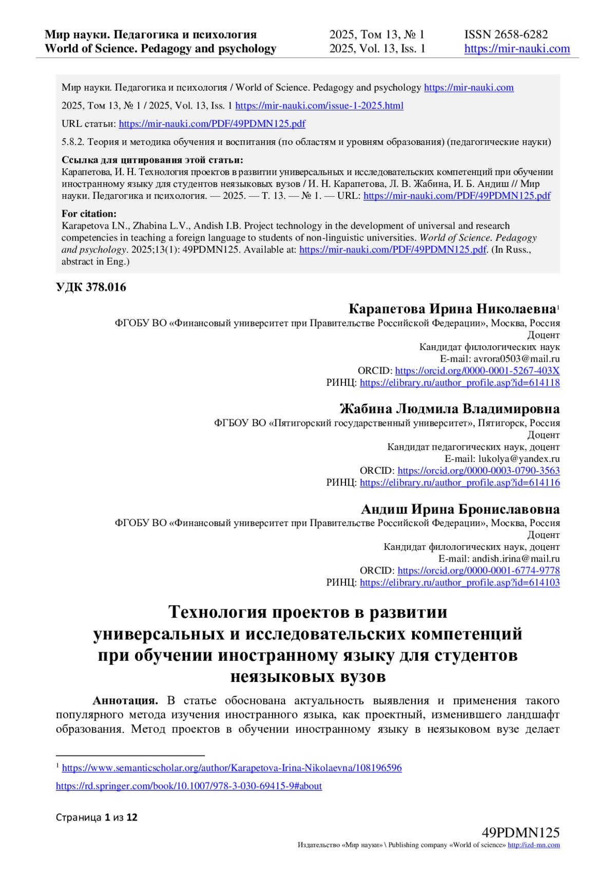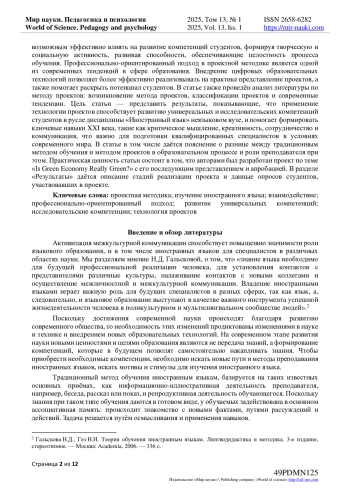 10. Utebekova A.K., Musalieva M.O., Omarova A.S., Yernazarova D.Zh. Using project methods in teaching a foreign language // Научный альманах. - 2021. - No. 11-3(85). URL: download/elibrary_47500016_17258889.pdf (дата обращения: 23.11.24). EDN: GGJFQX