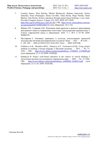 7. Carolina Santos, Eliza Rybska, Michal Klichowski, Barbara Jankowiak, Sylwia Jaskulska, Nuno Domingues, Diana Carvalho, Tânia Rocha, Hugo Paredes, Paulo Martins, João Rocha. Science education through project-based learning: a case study. Procedia Computer Science, Volume 219, 2023, ISSN 1877-0509, URL: https://www.sciencedirect.com/science/article/pii/S1877050923004775 (дата обращения: 26.11.24). DOI: 10.1016/j.procs.2023.01.465