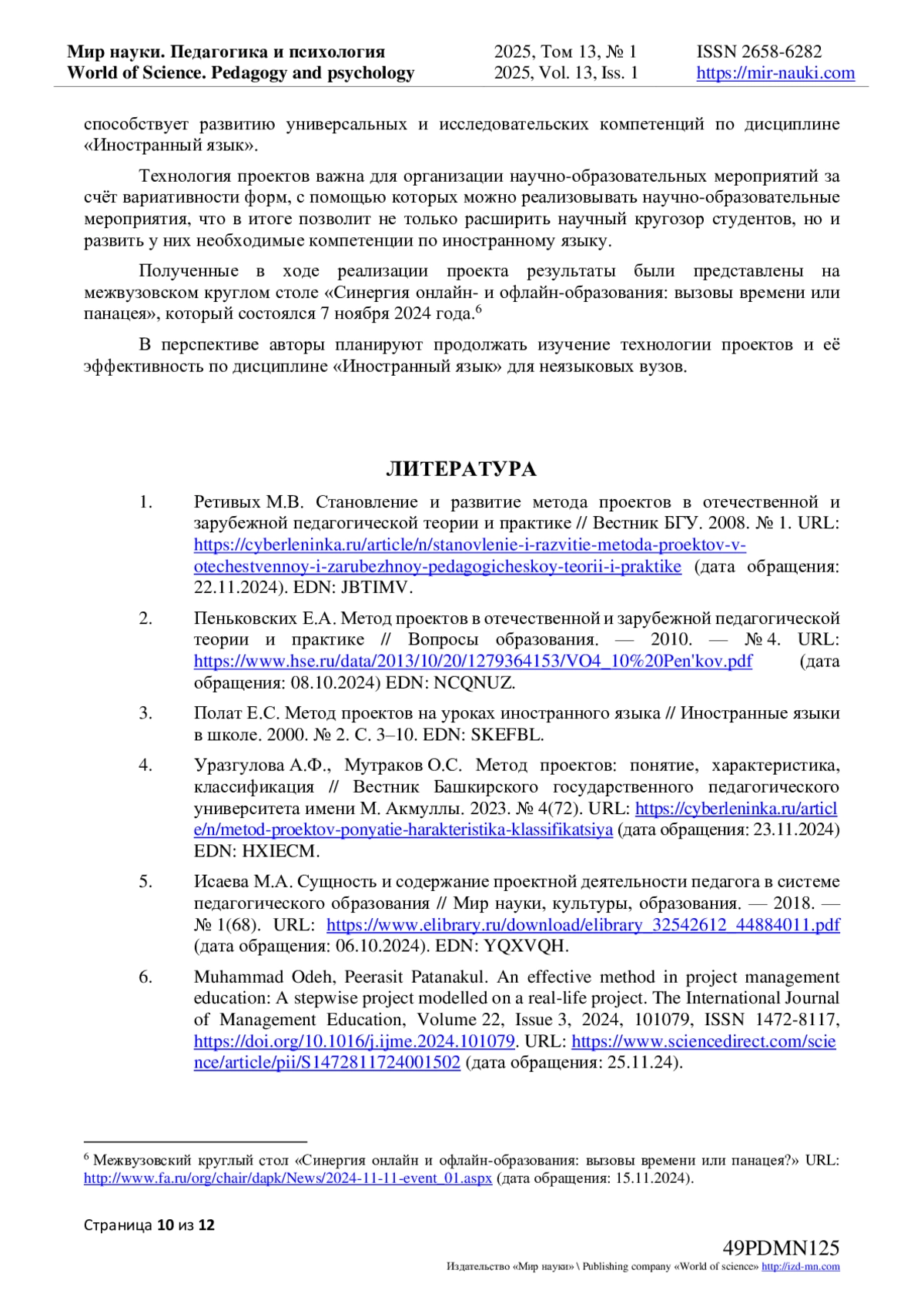 6. Muhammad Odeh, Peerasit Patanakul. An effective method in project management education: A stepwise project modelled on a real-life project. The International Journal of Management Education, Volume 22, Issue 3, 2024, 101079, ISSN 1472-8117, URL: https://www.sciencedirect.com/science/article/pii/S1472811724001502 (дата обращения: 25.11.24). DOI: 10.1016/j.ijme.2024.101079