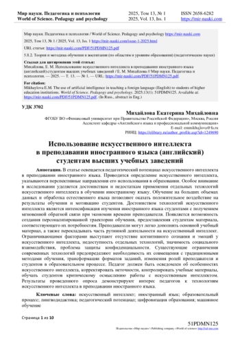9. Авраменко А.П. Опыт интеграции технологий искусственного интеллекта в иноязычное высшее образование: от цифровизации к автоматизации / А.П. Авраменко, В.А. Фадеева, В.В. Терновский // Вестник Московского университета. Серия 19. Лингвистика и межкультурная коммуникация. - 2024. - № 2. - С. 55-67. EDN: JYWFLB