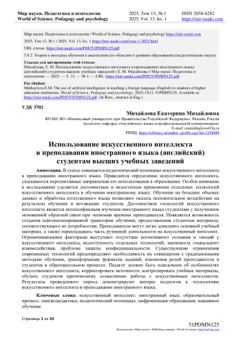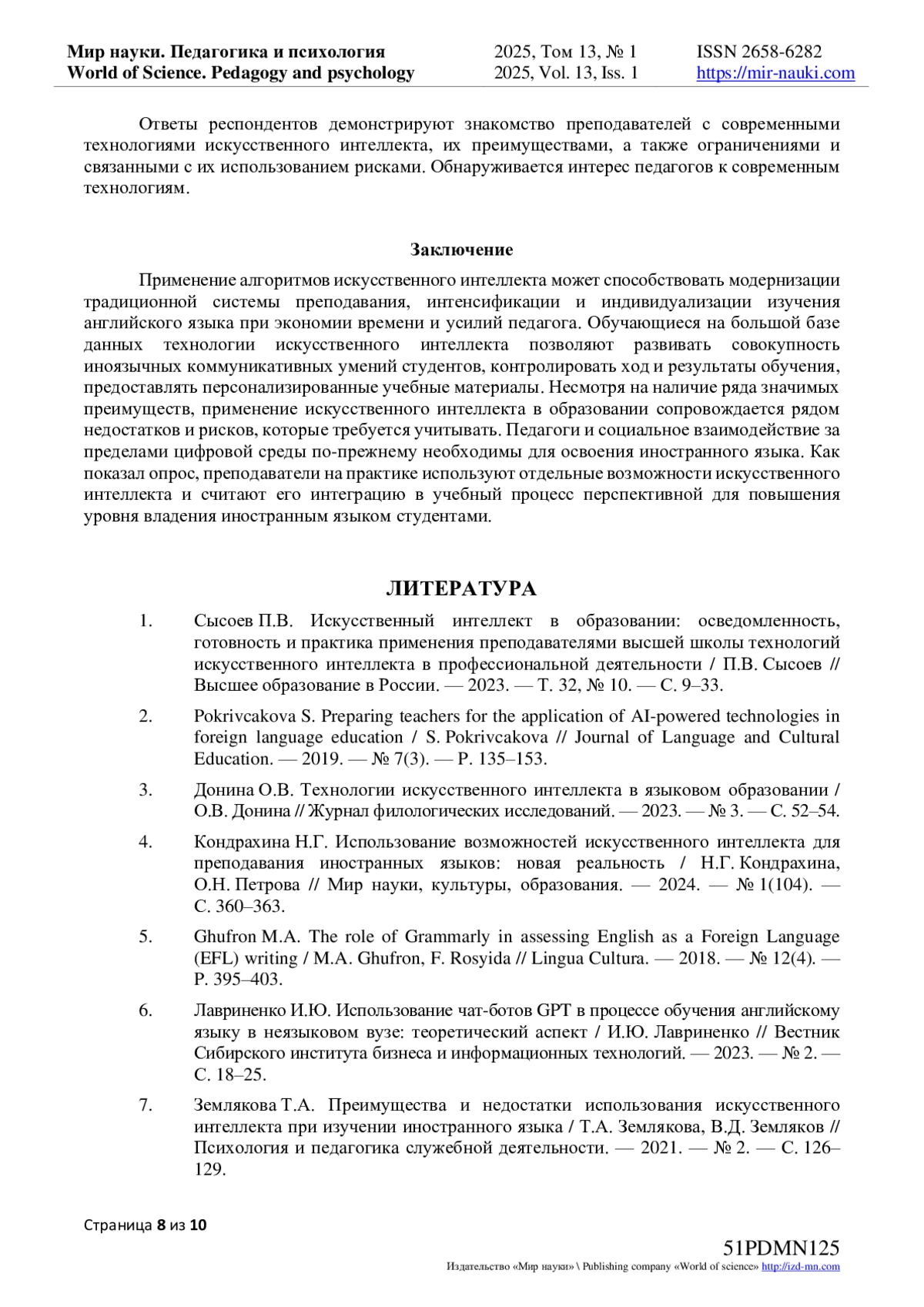 7. Землякова Т.А. Преимущества и недостатки использования искусственного интеллекта при изучении иностранного языка / Т.А. Землякова, В.Д. Земляков // Психология и педагогика служебной деятельности. - 2021. - № 2. - С. 126-129. EDN: XVUUKJ
