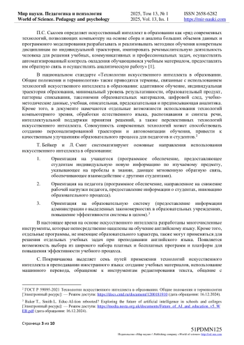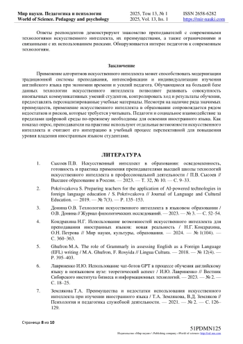 1. Сысоев П.В. Искусственный интеллект в образовании: осведомленность, готовность и практика применения преподавателями высшей школы технологий искусственного интеллекта в профессиональной деятельности / П.В. Сысоев // Высшее образование в России. - 2023. - Т. 32, № 10. - С. 9-33. EDN: TZYTKM