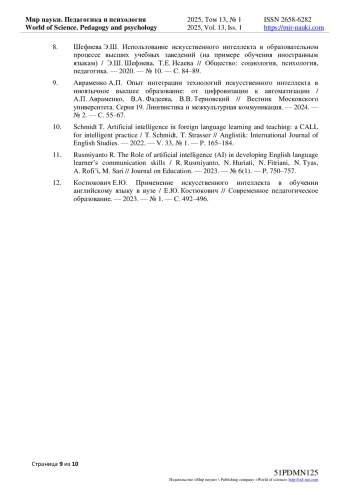 8. Шефиева Э.Ш. Использование искусственного интеллекта в образовательном процессе высших учебных заведений (на примере обучения иностранным языкам) / Э.Ш. Шефиева, Т.Е. Исаева // Общество: социология, психология, педагогика. - 2020. - № 10. - С. 84-89. EDN: OIJXCU