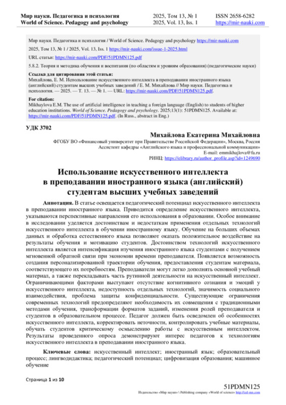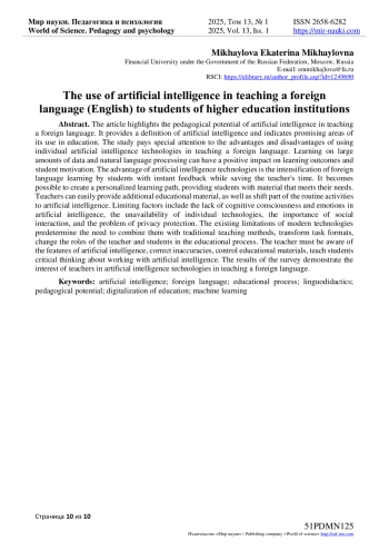В статье освещается педагогический потенциал искусственного интеллекта в преподавании иностранного языка. Приводится определение искусственного интеллекта, указываются перспективные направления его использования в образовании. Особое внимание в исследовании уделяется достоинствам и недостаткам применения отдельных технологий искусственного интеллекта в обучении иностранному языку. Обучение на больших объемах данных и обработка естественного языка позволяют оказать положительное воздействие на результаты обучения и мотивацию студентов. Достоинством технологий искусственного интеллекта является интенсификация изучения иностранного языка студентами с получением мгновенной обратной связи при экономии времени преподавателя. Появляется возможность создания персонализированной траектории обучения, предоставления студентам материала, соответствующего их потребностям. Преподаватели могут легко дополнять основной учебный материал, а также перекладывать часть рутинной деятельности на искусственный интеллект. Ограничивающими факторами выступают отсутствие когнитивного сознания и эмоций у искусственного интеллекта, недоступность отдельных технологий, значимость социального взаимодействия, проблема защиты конфиденциальности. Существующие ограничения современных технологий предопределяют необходимость их совмещения с традиционными методами обучения, трансформации форматов заданий, изменения ролей преподавателя и студентов в образовательном процессе. Педагог должен быть осведомлен об особенностях искусственного интеллекта, корректировать неточности, контролировать учебные материалы, обучать студентов критическому осмыслению работы с искусственным интеллектом. Результаты проведенного опроса демонстрируют интерес педагогов к технологиям искусственного интеллекта в преподавании иностранного языка.