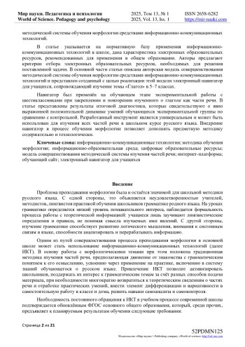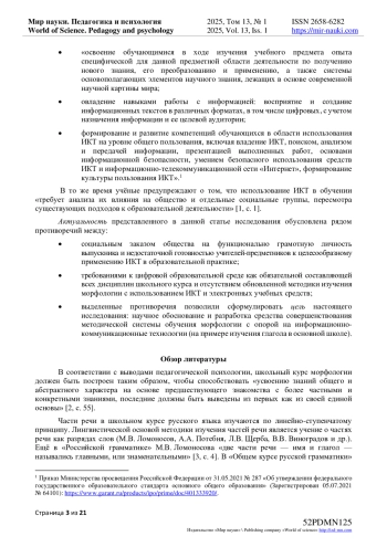 Статья посвящена вопросу использования информационно-коммуникационных технологий в обучении русскому языку в основной школе. Авторами представлен краткий анализ научной литературы о частях речи в русском языке, освещена специфика и трудности усвоения морфологических тем обучающимися, рассмотрены требования образовательного стандарта к результатам изучения частей речи. В первой части статьи отмечено, что достижение желаемых результатов обучения может быть более эффективным при условии обогащения методической системы обучения морфологии средствами информационно-коммуникационных технологий. В статье указывается на нормативную базу применения информационно-коммуникационных технологий в школе, дана характеристика электронных образовательных ресурсов, рекомендованных для применения в общем образовании. Авторы предлагают критерии отбора электронных образовательных ресурсов, необходимых для решения поставленной задачи. В основной части статьи описана авторская модель совершенствования методической системы обучения морфологии средствами информационно-коммуникационных технологий и представлен созданный с целью реализации этой модели электронный навигатор для учащихся, сопровождающий изучение темы «Глагол» в 5-7 классах. Навигатор был применён на обучающем этапе экспериментальной работы с шестиклассниками при закреплении и повторении изученного о глаголе как части речи. В статье представлены результаты итоговой диагностики, которые свидетельствуют о явно выраженной положительной динамике умений обучающихся экспериментальной группы по сравнению с контрольной. Разработанный инструмент является универсальным и может быть использован для изучения всех частей речи в школьном курсе русского языка. Внедрение навигатор в процесс обучения морфологии позволяет дополнять предметную методику содержательно и технологически.