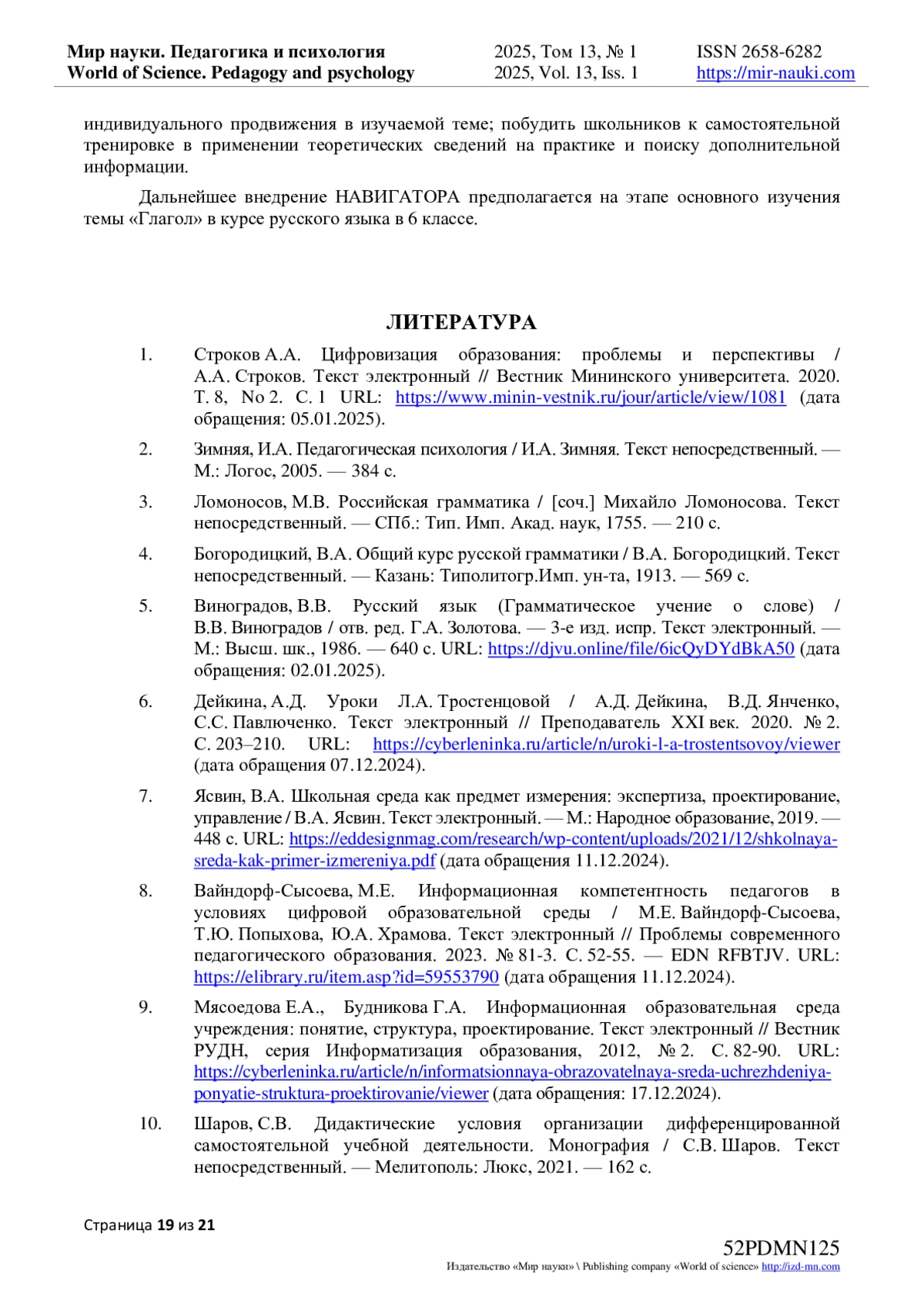 1. Строков А.А. Цифровизация образования: проблемы и перспективы / А.А. Строков. Текст электронный // Вестник Мининского университета. 2020. Т. 8, No 2. С. 1 URL: https://www.minin-vestnik.ru/jour/article/view/1081 (дата обращения: 05.01.2025). EDN: QOVVGC