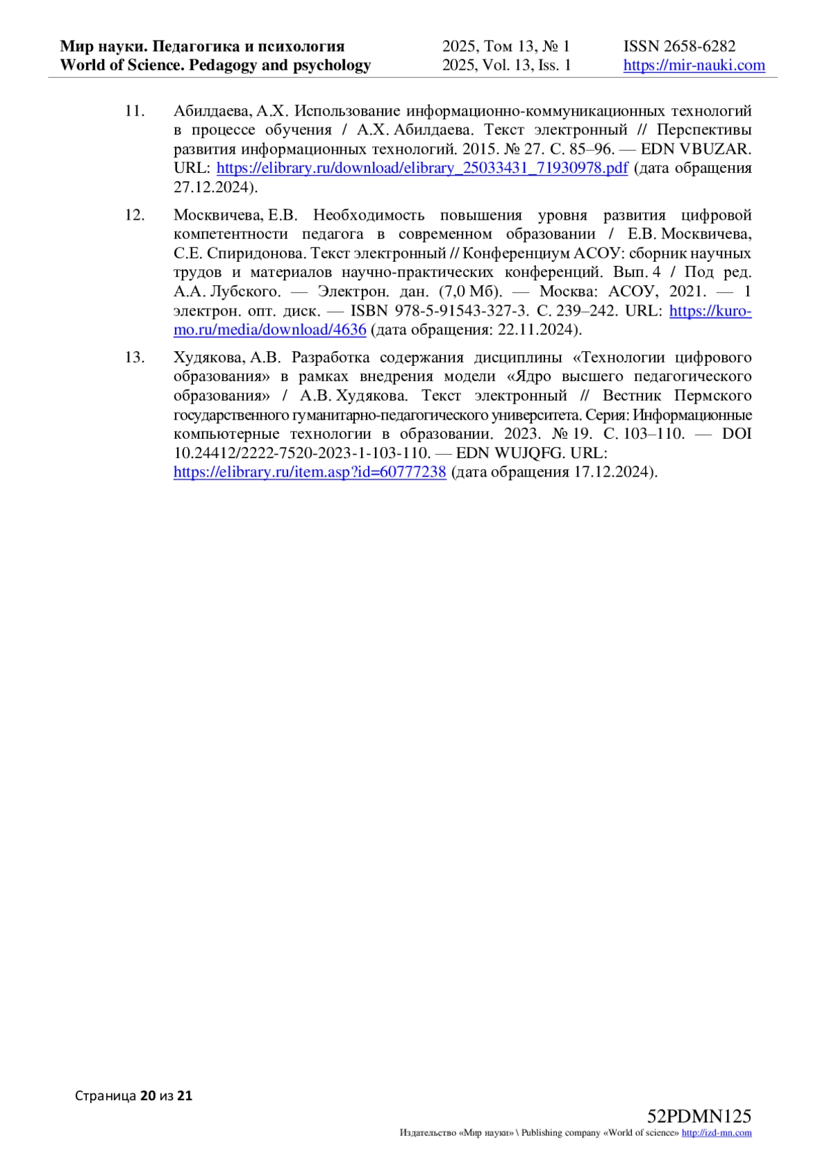 11. Абилдаева, А.Х. Использование информационно-коммуникационных технологий в процессе обучения / А.Х. Абилдаева. Текст электронный // Перспективы развития информационных технологий. 2015. № 27. С. 85-96. URL: download/elibrary_25033431_71930978.pdf (дата обращения 27.12.2024). EDN: VBUZAR