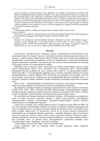 В якутском языке представлено более 70 наименований снега, в том числе около 30 диалектных обозначений. В основе мотивирующих признаков диалектных названий лежат физические свойства снега, которые зависят от окружающей среды (продолжительная зима, время года), сравнение с внешними признаками животных (зайца, бурундука, вороны, пуночки), а также функциональный признак - по связи с народными приметами и с традиционным промыслом (охотой). Формальным способом выражения мотивирующего признака является сочетание компонентов и оформление одного из них аффиксом принадлежности. Основным типом мотивации диалектных названий снега является семантический, обусловленный значением производящего слова.