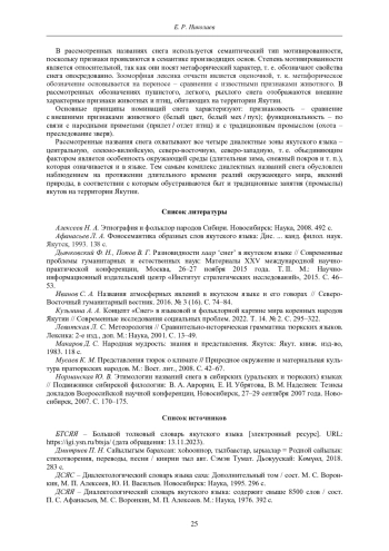 D’yachkovskiy F. N., Popov V. G. Raznovidnosti khaar “sneg” v yakutskom yazyke [Varieties of haar “snow” in the Yakut language]. In: Sovremennye problemy gumanitarnykh i estestvennykh nauk: materialy XXV mezhdunarodnoy nauchno-prakticheskoy konferentsii, Moskva, 26-27 noyabrya 2015 goda [Contemporary Problems of the Humanities and Natural Sciences: Proceedings of the XXV International Scientific and Practical Conference, Moscow, November 26-27, 2015]. “Institut strategicheskikh issledovaniy”. Moscow, Nauchno-informatsionnyy izdatel’skiy tsentr “Institut strategicheskikh issledovaniy”, 2015, vol. II, pp. 46-53. (In Russ.).