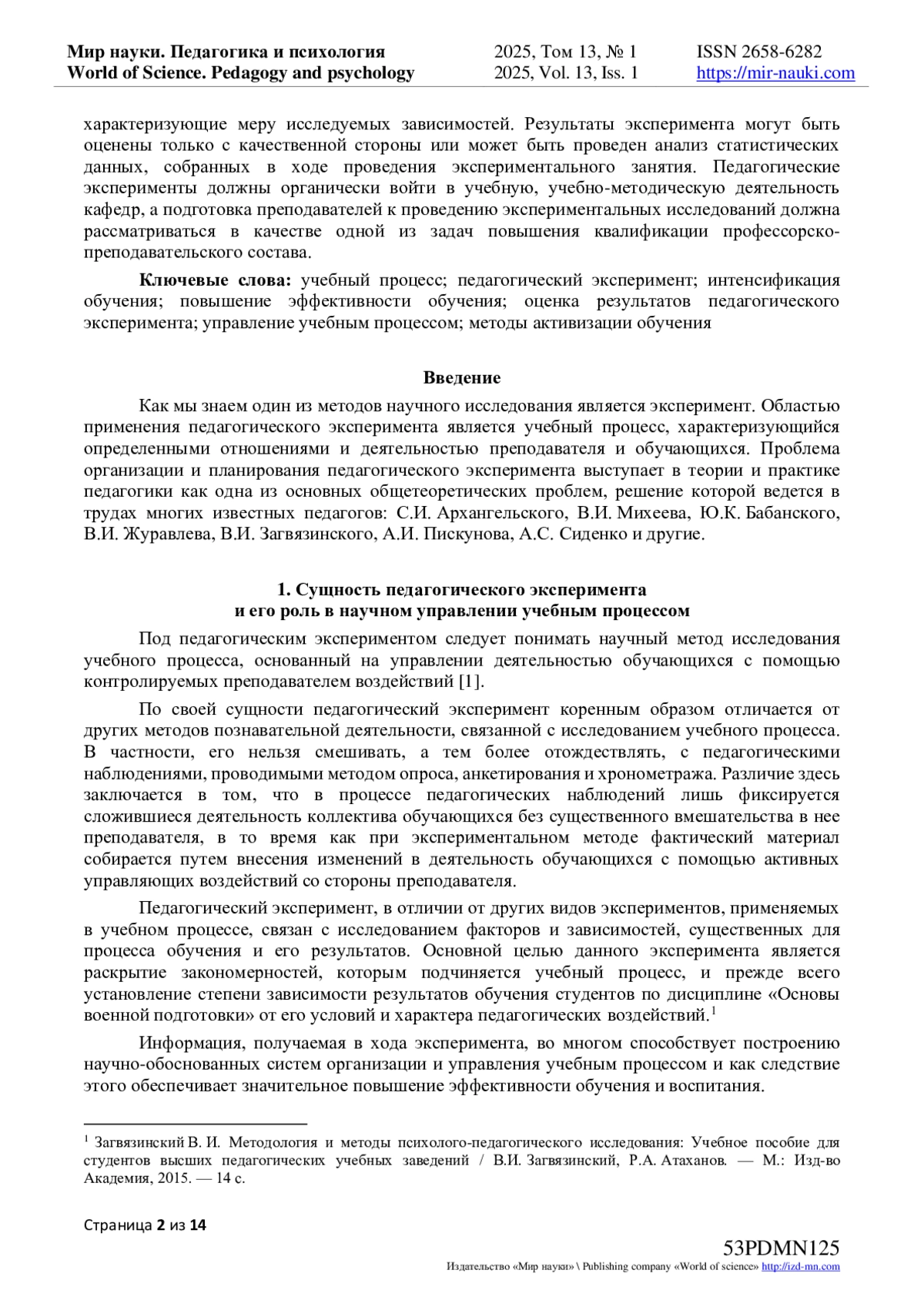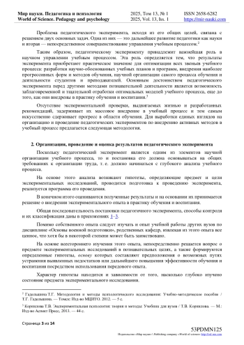 9. Ольховский, Д.В. Педагогический эксперимент: методика проведения и внедрения в образовательную деятельность / Д.В. Ольховский, А.А. Лоскутов // Современные проблемы науки и образования. - 2018. № 6(56). - С. 4-5. EDN: YVMMCT