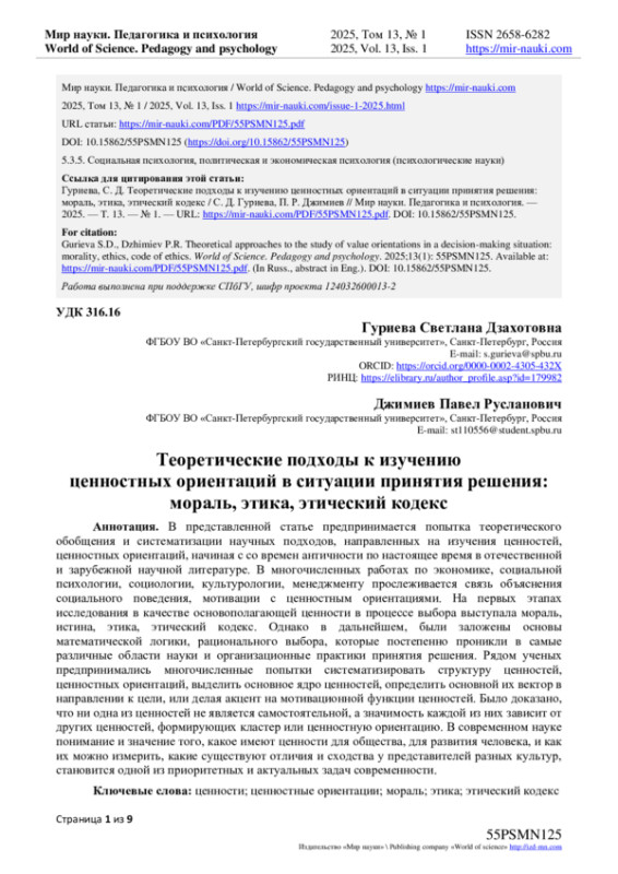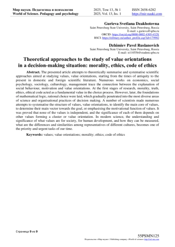 В представленной статье предпринимается попытка теоретического обобщения и систематизации научных подходов, направленных на изучения ценностей, ценностных ориентаций, начиная с со времен античности по настоящее время в отечественной и зарубежной научной литературе. В многочисленных работах по экономике, социальной психологии, социологии, культурологии, менеджменту прослеживается связь объяснения социального поведения, мотивации с ценностным ориентациями. На первых этапах исследования в качестве основополагающей ценности в процессе выбора выступала мораль, истина, этика, этический кодекс. Однако в дальнейшем, были заложены основы математической логики, рационального выбора, которые постепенно проникли в самые различные области науки и организационные практики принятия решения. Рядом ученых предпринимались многочисленные попытки систематизировать структуру ценностей, ценностных ориентаций, выделить основное ядро ценностей, определить основной их вектор в направлении к цели, или делая акцент на мотивационной функции ценностей. Было доказано, что ни одна из ценностей не является самостоятельной, а значимость каждой из них зависит от других ценностей, формирующих кластер или ценностную ориентацию. В современном науке понимание и значение того, какое имеют ценности для общества, для развития человека, и как их можно измерить, какие существуют отличия и сходства у представителей разных культур, становится одной из приоритетных и актуальных задач современности.