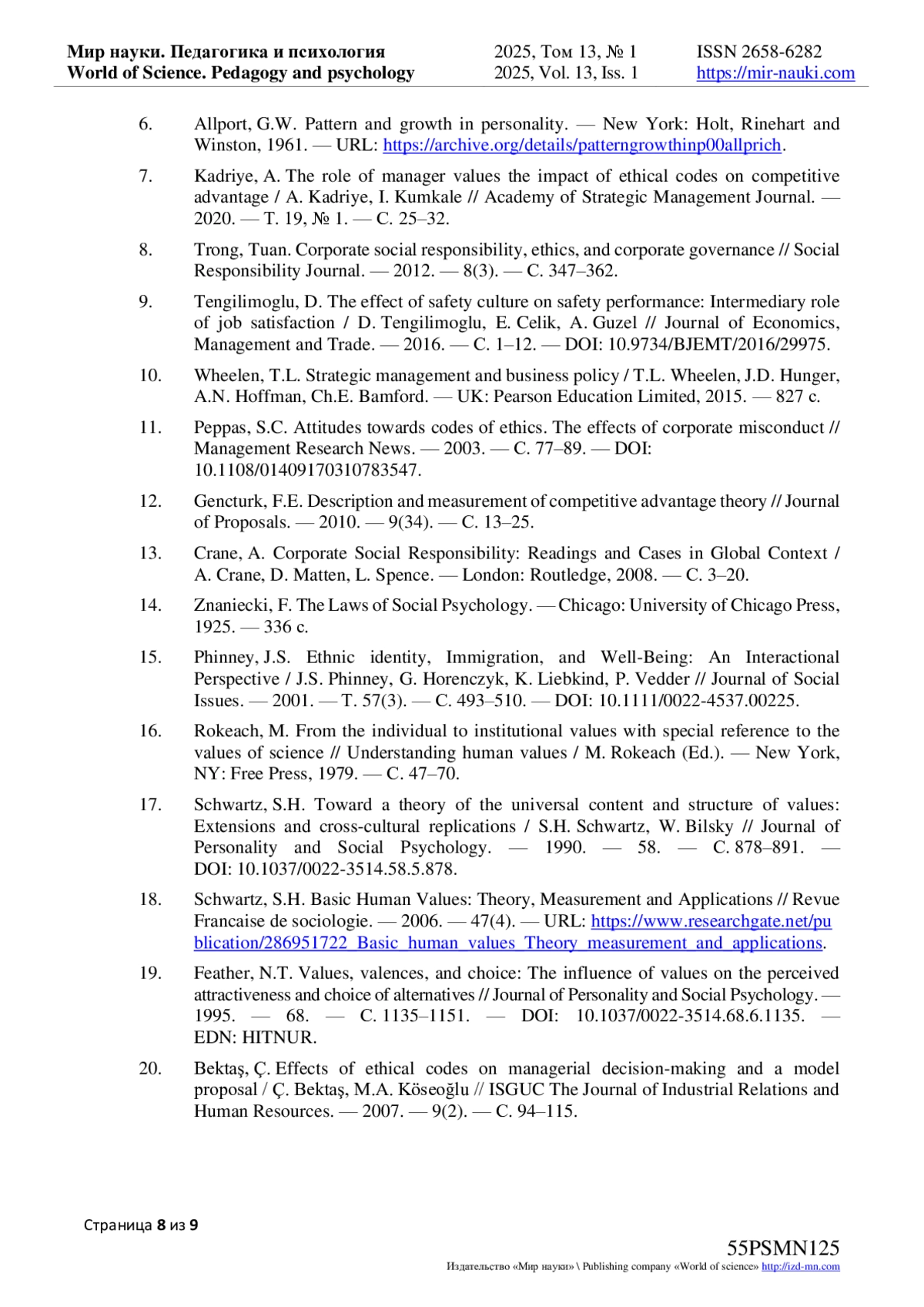 7. Kadriye, A. The role of manager values the impact of ethical codes on competitive advantage / A. Kadriye, I. Kumkale // Academy of Strategic Management Journal. - 2020. - Т. 19, № 1. - С. 25-32.
