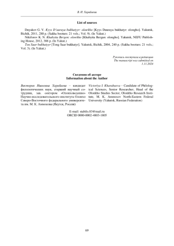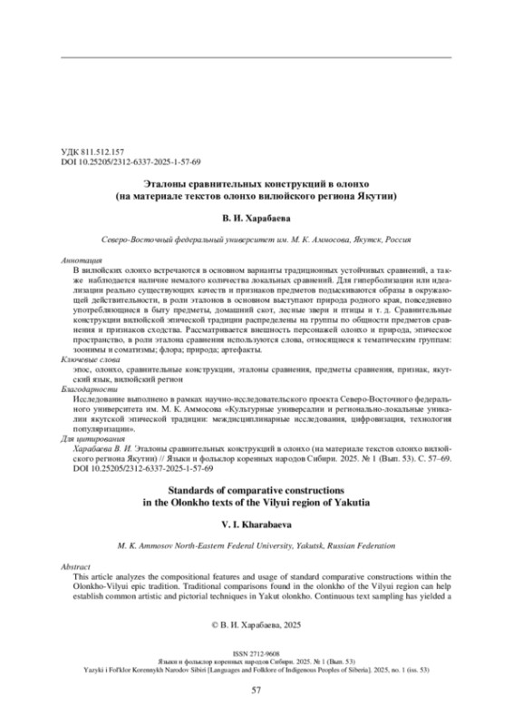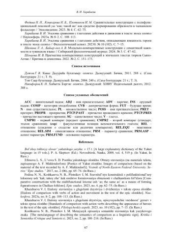 21. Харабаева В. И. Эталоны сравнения с глаголами действия, описывающие внешность героев в тексте эпоса олонхо // Филологический аспект. 2023б. № 10 (102). С. 7-15.
