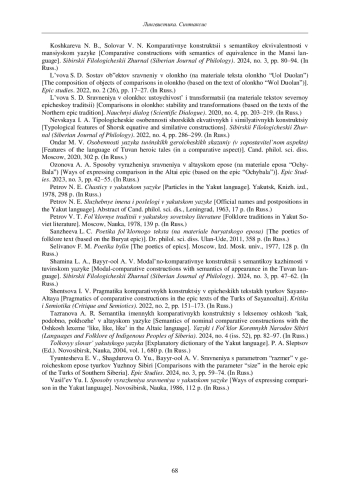 9. Озонова А. А. Способы выражения сравнения в алтайском эпосе (на материале эпоса “Очы-Бала”) // Эпосоведение. 2023. № 3. С. 42-55.