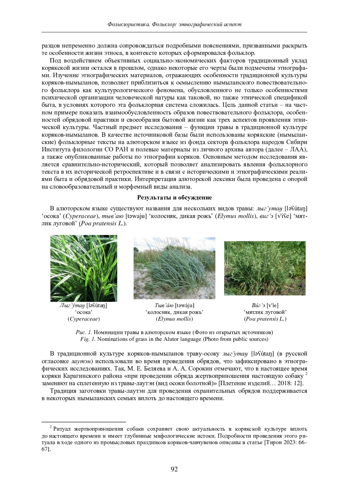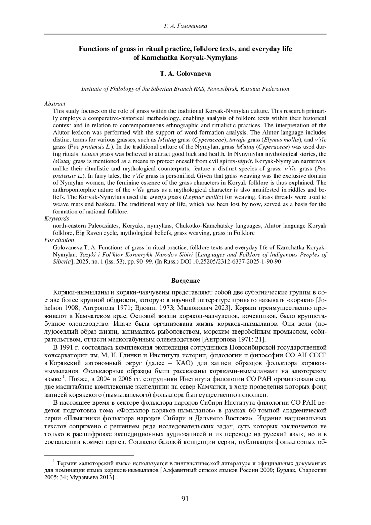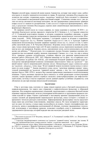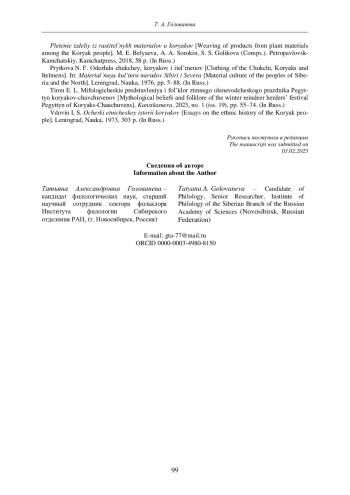 Pletenie izdeliy iz rastitel’nykh materialov u koryakov [Weaving of products from plant materials among the Koryak people]. M. E. Belyaeva, A. A. Sorokin, S. S. Golikova (Comps.). Petropavlovsk-Kamchatskiy, Kamchatpress, 2018, 58 p. (In Russ.).