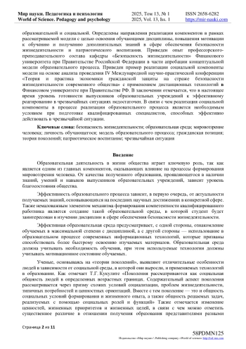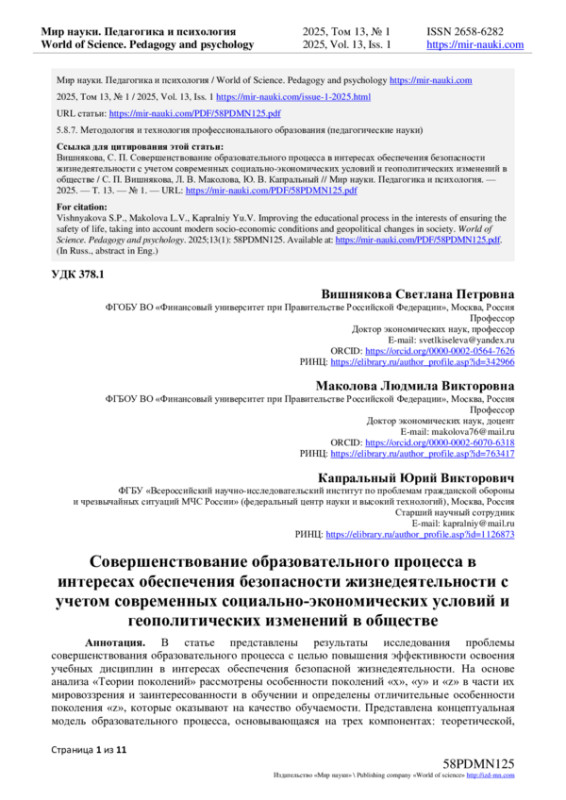 В статье представлены результаты исследования проблемы совершенствования образовательного процесса с целью повышения эффективности освоения учебных дисциплин в интересах обеспечения безопасной жизнедеятельности. На основе анализа «Теории поколений» рассмотрены особенности поколений «х», «у» и «z» в части их мировоззрения и заинтересованности в обучении и определены отличительные особенности поколения «z», которые оказывают на качество обучаемости. Представлена концептуальная модель образовательного процесса, основывающаяся на трех компонентах: теоретической, образовательной и социальной. Определены направления реализации компонентов в рамках рассматриваемой модели с целью освоения обучающими дисциплины, повышения мотивации к обучению и получению дополнительных знаний в сфере обеспечения безопасности жизнедеятельности и патриотического воспитания. Приведен опыт профессорского-преподавательского состава кафедры «Безопасность жизнедеятельности» Финансового университета при Правительстве Российской Федерации в части апробации концептуальной модели образовательного процесса. Приведен пример реализации социальной компоненты модели на основе анализа проведения IV Международной научно-практической конференции «Теория и практика экономики гражданской защиты на страже безопасности жизнедеятельности современного общества» с применением дистанционных технологий в Финансовом университете при Правительстве РФ. В заключении отмечается, что в настоящее время уровень готовности выпускников образовательных учреждений к эффективному реагированию в чрезвычайных ситуациях недостаточен. В связи с чем реализация социальной компоненты в процессе реализации образовательного процесса является необходимым условием при подготовке квалифицированных специалистов, способных эффективно действовать в чрезвычайной ситуации.