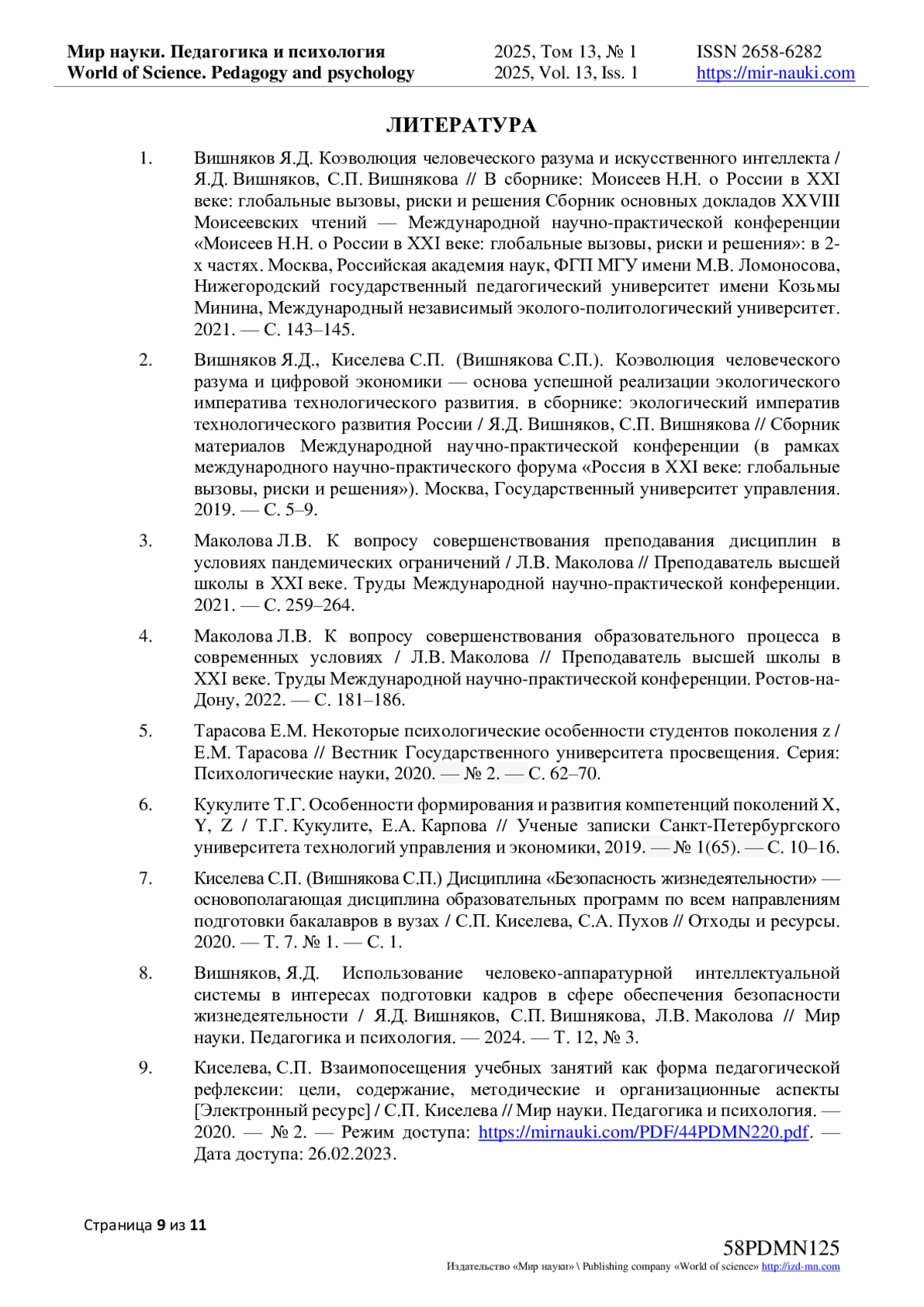 9. Киселева, С.П. Взаимопосещения учебных занятий как форма педагогической рефлексии: цели, содержание, методические и организационные аспекты [Электронный ресурс] / С.П. Киселева // Мир науки. Педагогика и психология. - 2020. - № 2. - Режим доступа: https://mirnauki.com/PDF/44PDMN220.pdf. - Дата доступа: 26.02.2023.