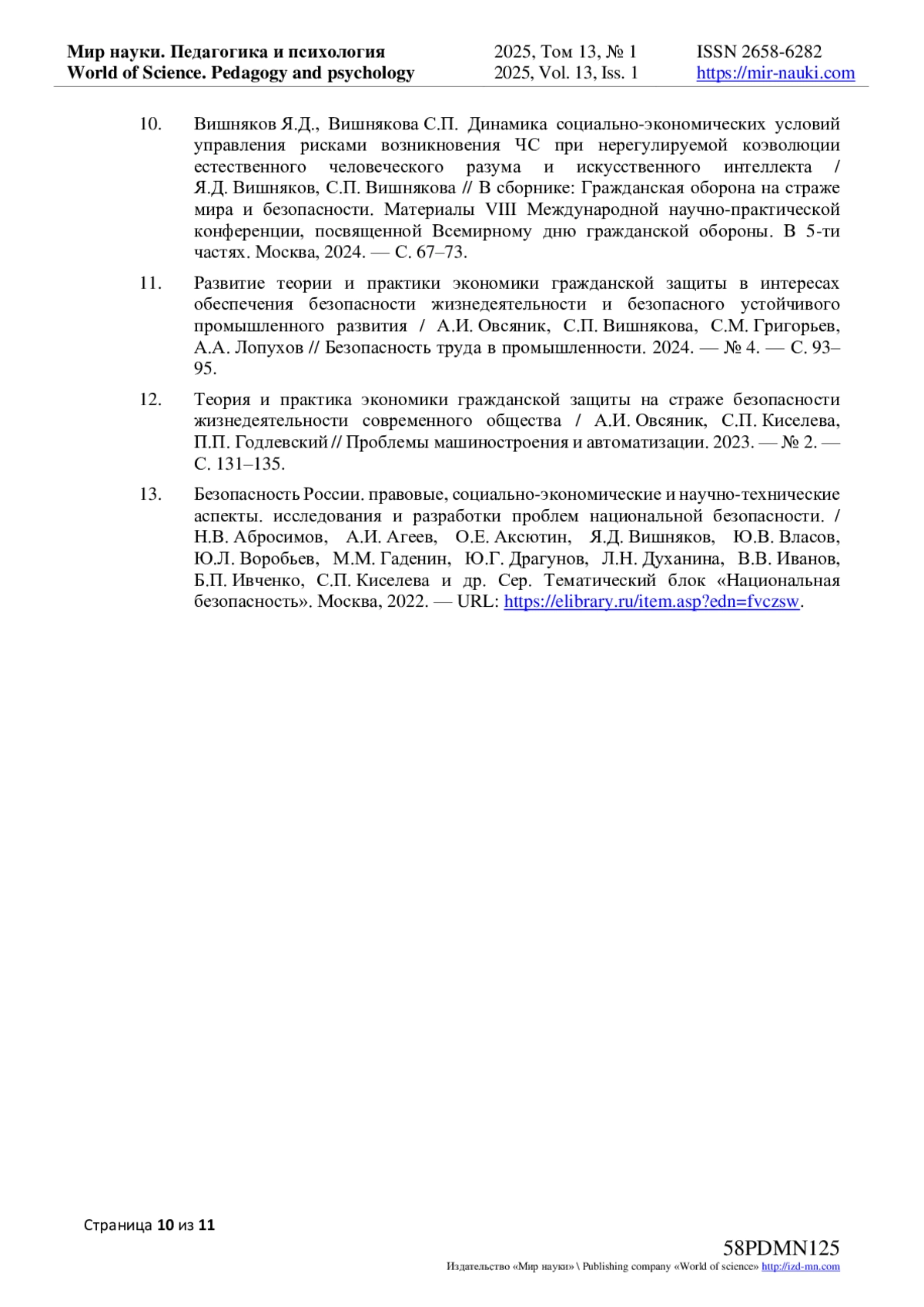 10. Вишняков Я.Д., Вишнякова С.П. Динамика социально-экономических условий управления рисками возникновения ЧС при нерегулируемой коэволюции естественного человеческого разума и искусственного интеллекта / Я.Д. Вишняков, С.П. Вишнякова // В сборнике: Гражданская оборона на страже мира и безопасности. Материалы VIII Международной научно-практической конференции, посвященной Всемирному дню гражданской обороны. В 5-ти частях. Москва, 2024. - С. 67-73. EDN: YSEDAU