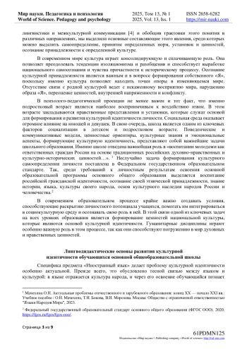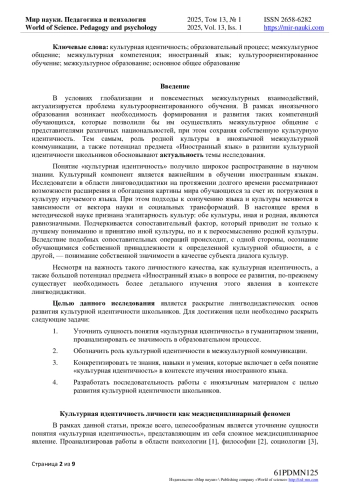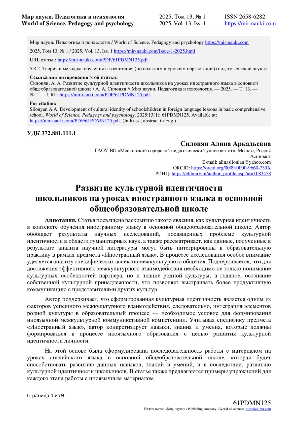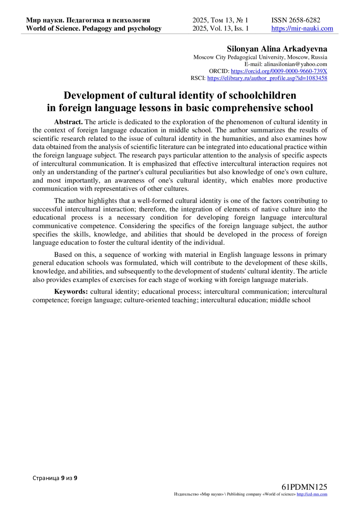 Статья посвящена раскрытию такого явления, как культурная идентичность в контексте обучения иностранному языку в основной общеобразовательной школе. Автор обобщает результаты научных исследований, посвященных проблеме культурной идентичности в области гуманитарных наук, а также рассматривает, как данные, полученные в результате анализа научной литературы могут быть интегрированы в образовательную практику в рамках предмета «Иностранный язык». В процессе исследования особое внимание уделяется анализу специфических аспектов межкультурного общения. Подчеркивается, что для достижения эффективного межкультурного взаимодействия необходимо не только понимание культурных особенностей партнера, но и знание родной культуры, а главное, осознание собственной культурной принадлежности, что позволяет выстраивать более продуктивную коммуникацию с представителями других культур. Автор подчеркивает, что сформированная культурная идентичность является одним из факторов успешного межкультурного взаимодействия, следовательно, интеграция элементов родной культуры в образовательный процесс - необходимое условие для формирования иноязычной межкультурной коммуникативной компетенции. Учитывая специфику предмета «Иностранный язык», автор конкретизирует навыки, знания и умения, которые должны формироваться в процессе иноязычного образования с целью развития культурной идентичности личности. На этой основе была сформулирована последовательность работы с материалом на уроках английского языка в основной общеобразовательной школе, которая будет способствовать развитию данных навыков, знаний и умений, и в последствии, развитию культурной идентичности школьников. В статье также предлагаются примеры упражнений для каждого этапа работы с иноязычным материалом.