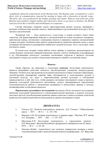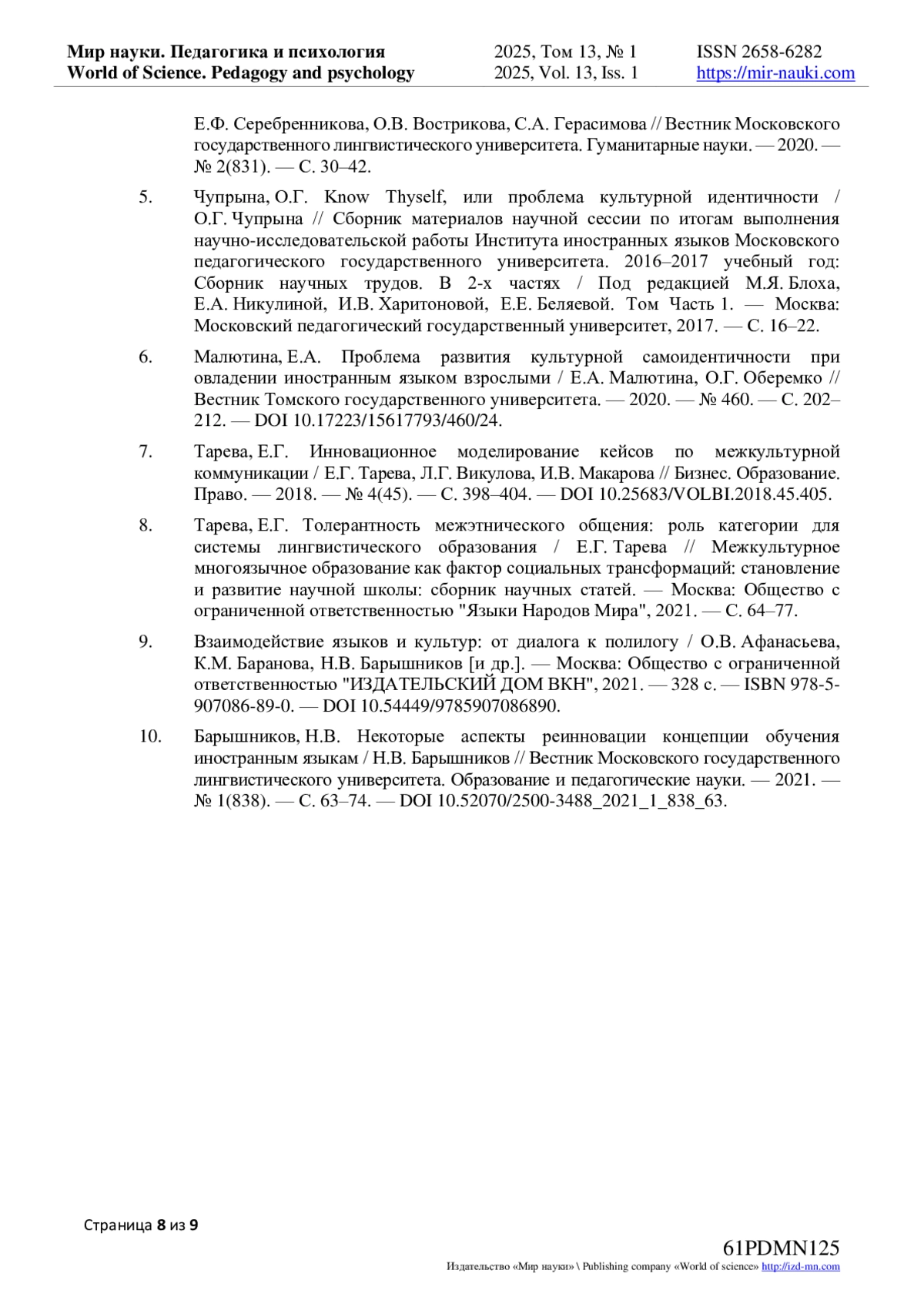 6. Малютина, Е.А. Проблема развития культурной самоидентичности при овладении иностранным языком взрослыми / Е.А. Малютина, О.Г. Оберемко // Вестник Томского государственного университета. - 2020. - № 460. - С. 202-212. DOI: 10.17223/15617793/460/24