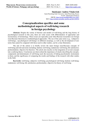 Цель статьи - краткий обзор и актуализация информации об основных зарубежных концепциях благополучия, а также соответствующих понятиях и терминах, используемых в современных работах иностранных авторов (в том числе: гедонистическое благополучие; эвдаймонистическое благополучие; общая удовлетворенность жизнью; преференциализм; теории показателей объективного списка). Приводятся определения благополучия и близких ему понятий, соответствующие различным подходам. Кроме того, затрагивается тема интеграции нескольких концепций в рамках одной теории благополучия. Делается вывод о важности четкого описания используемых концепций, компонентов и детерминант благополучия, увязки с ними применяемых психометрических инструментов, а также сопоставления полученных результатов и выводов исследования с другими работами в изучаемой области.