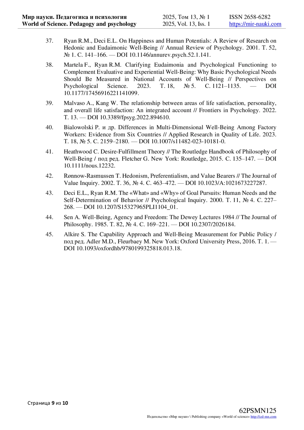 37. Ryan R.M., Deci E.L. On Happiness and Human Potentials: A Review of Research on Hedonic and Eudaimonic Well-Being // Annual Review of Psychology. 2001. Т. 52, № 1. С. 141-166. DOI: 10.1146/annurev.psych.52.1.141 EDN: HEYQGR