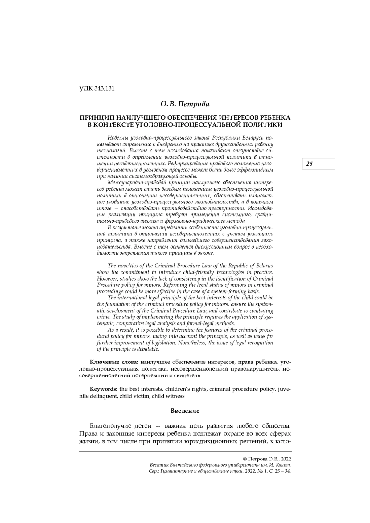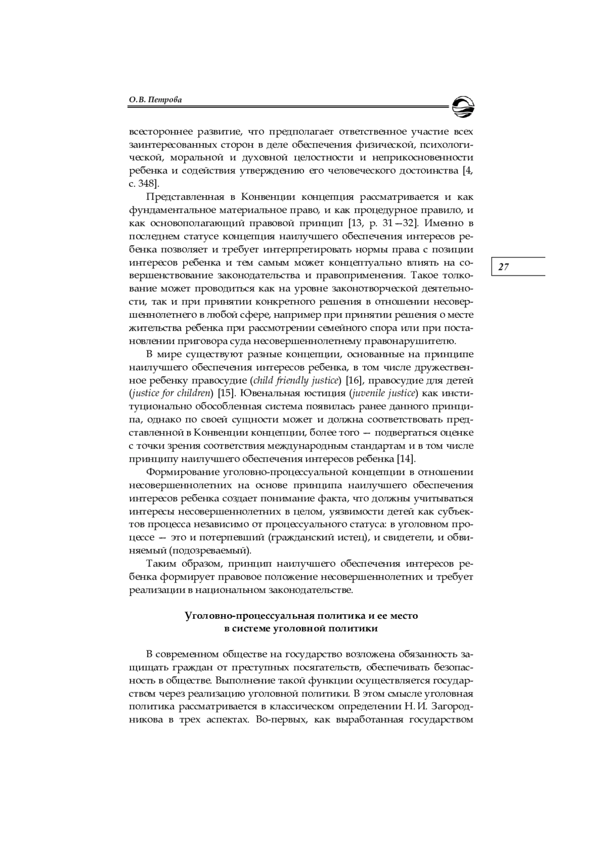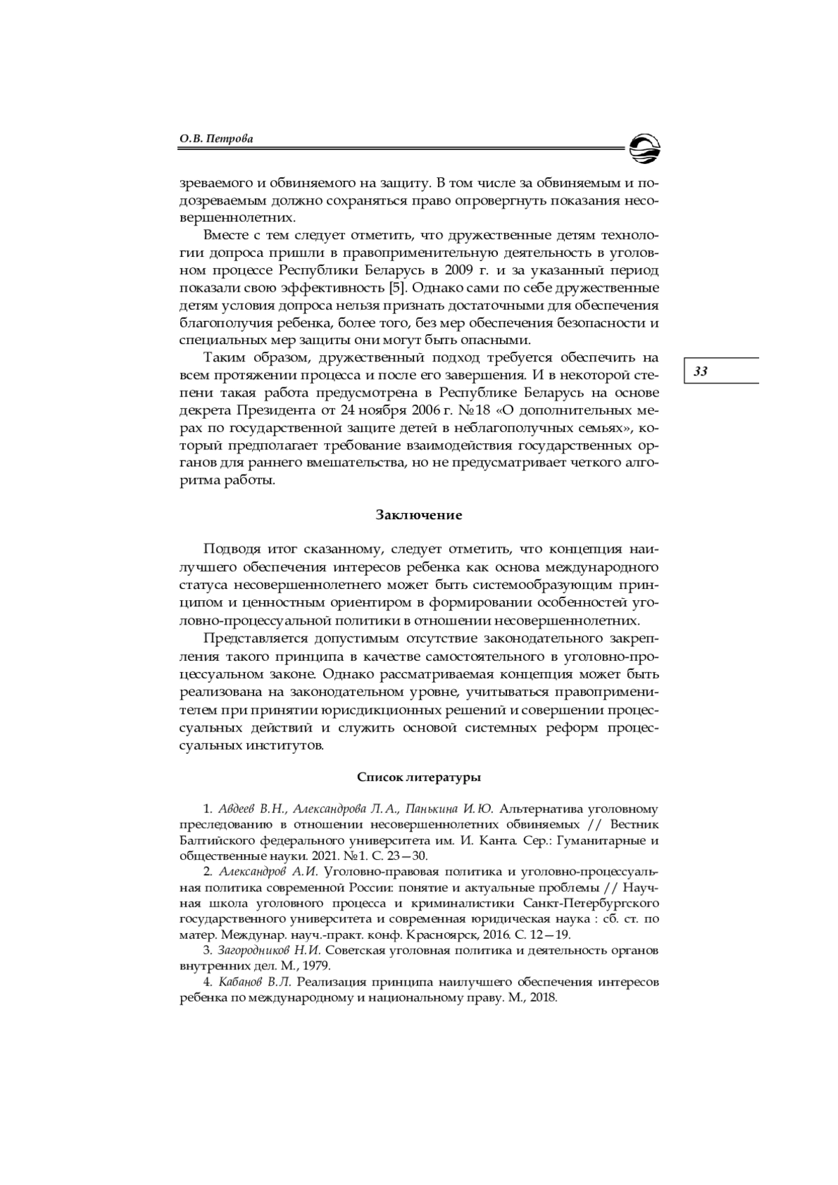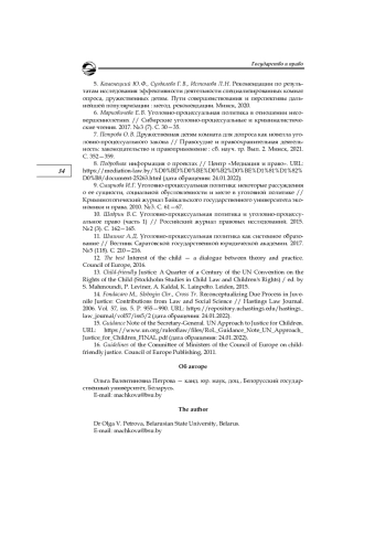 7. Петрова О. В. Дружественная детям комната для допроса как новелла уголовно-процессуального закона // Правосудие и правоохранительная деятельность: законодательство и правоприменение: сб. науч. тр. Вып. 2. Минск, 2021. С. 352-359. EDN: JJBXRQ