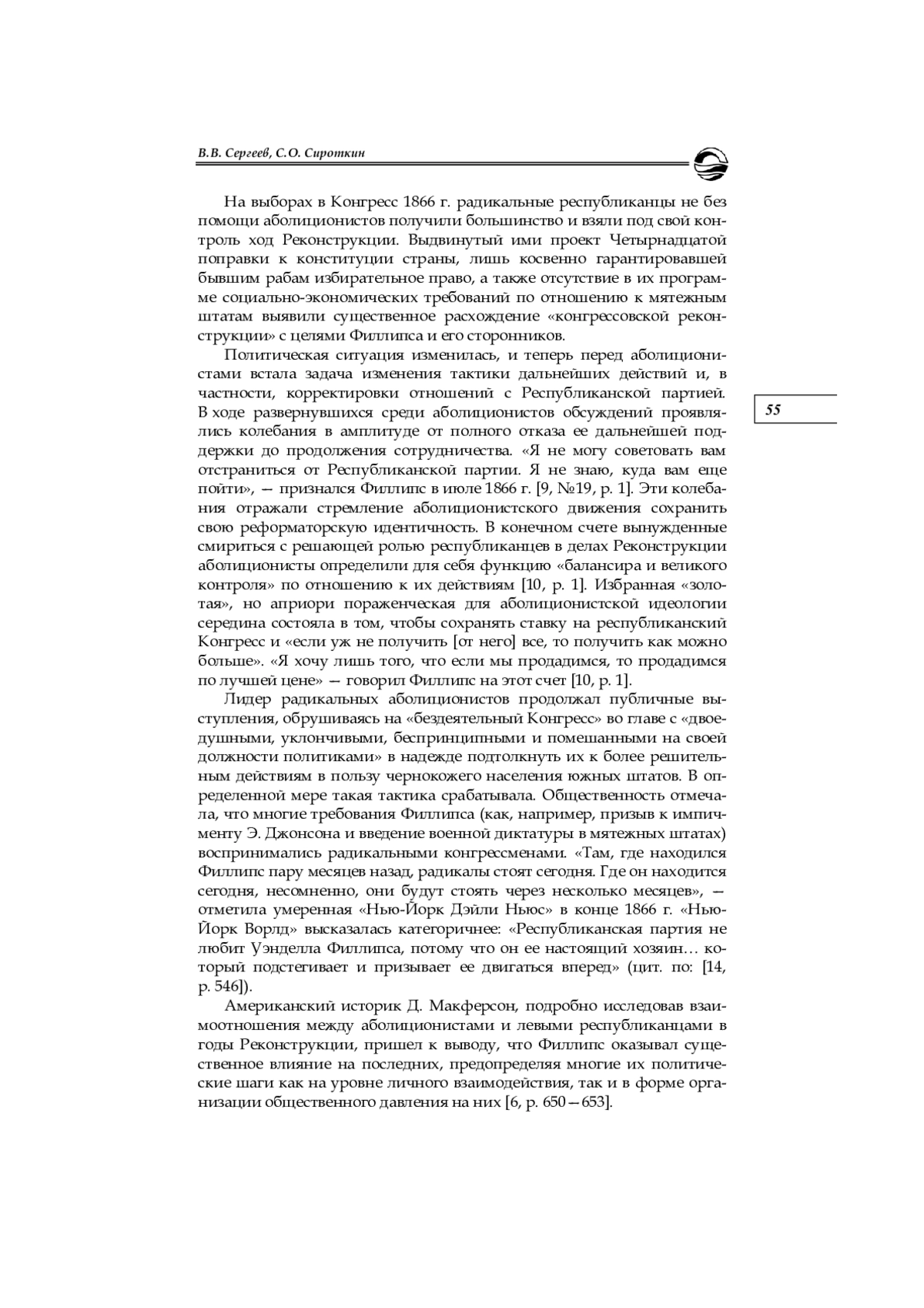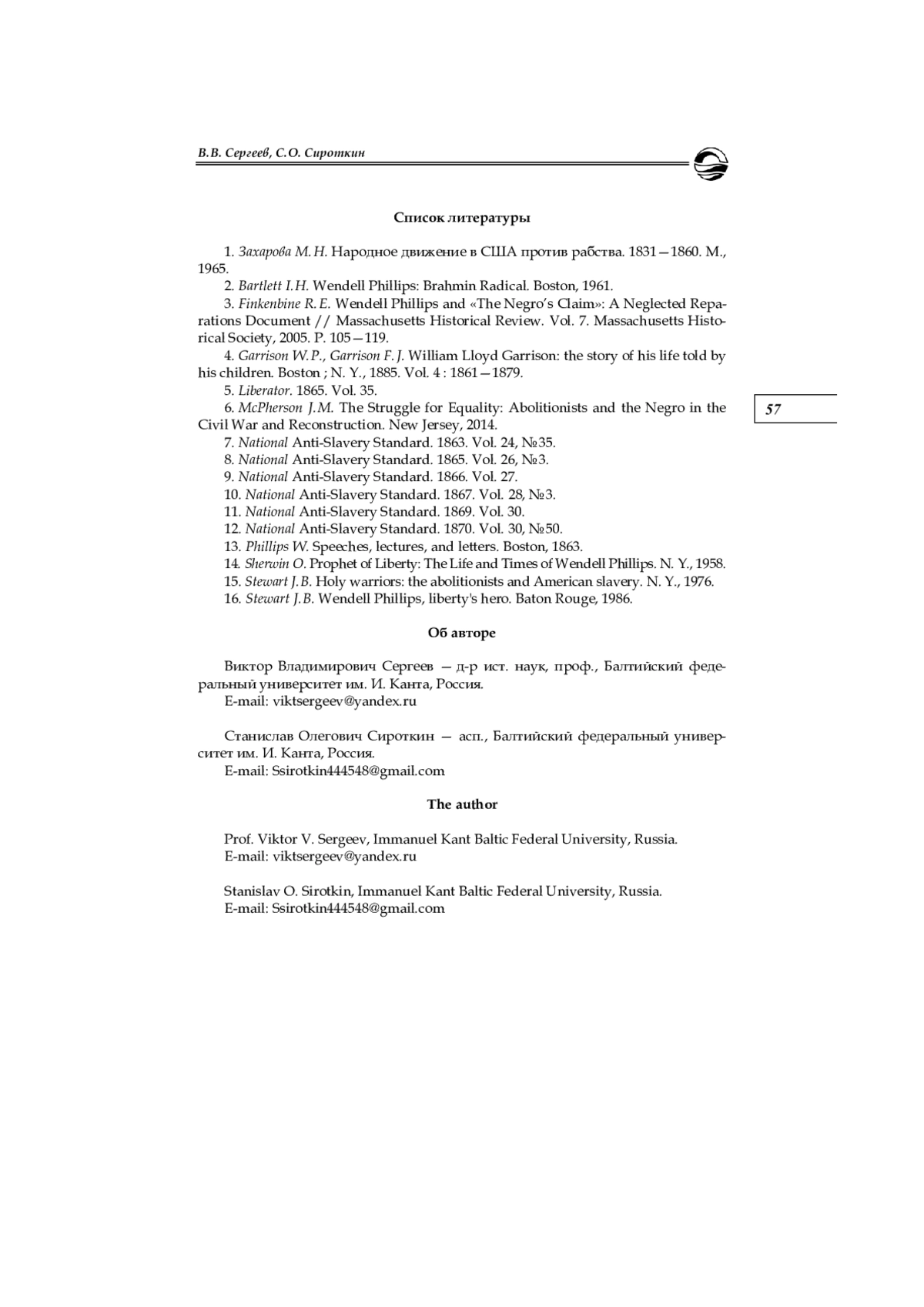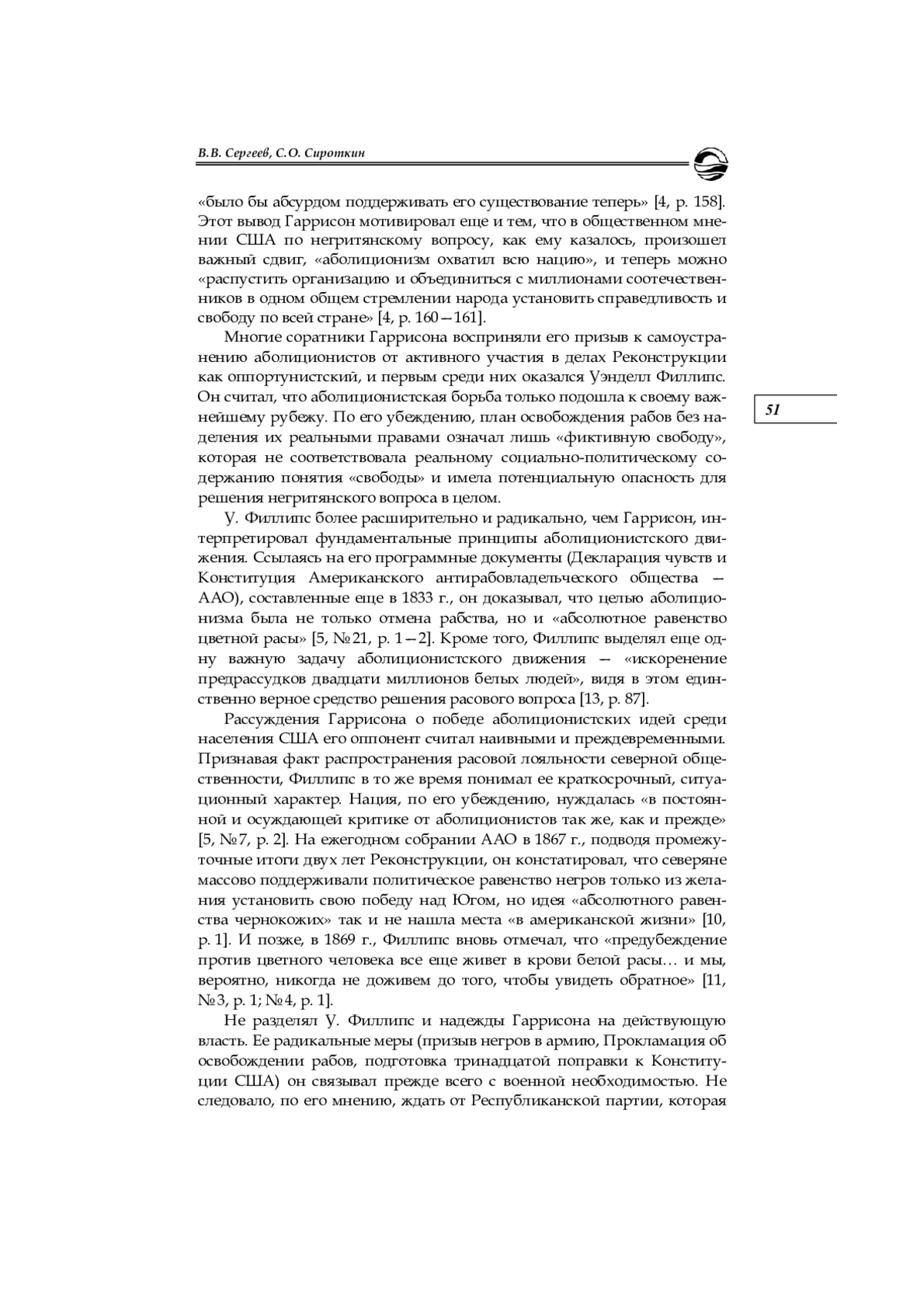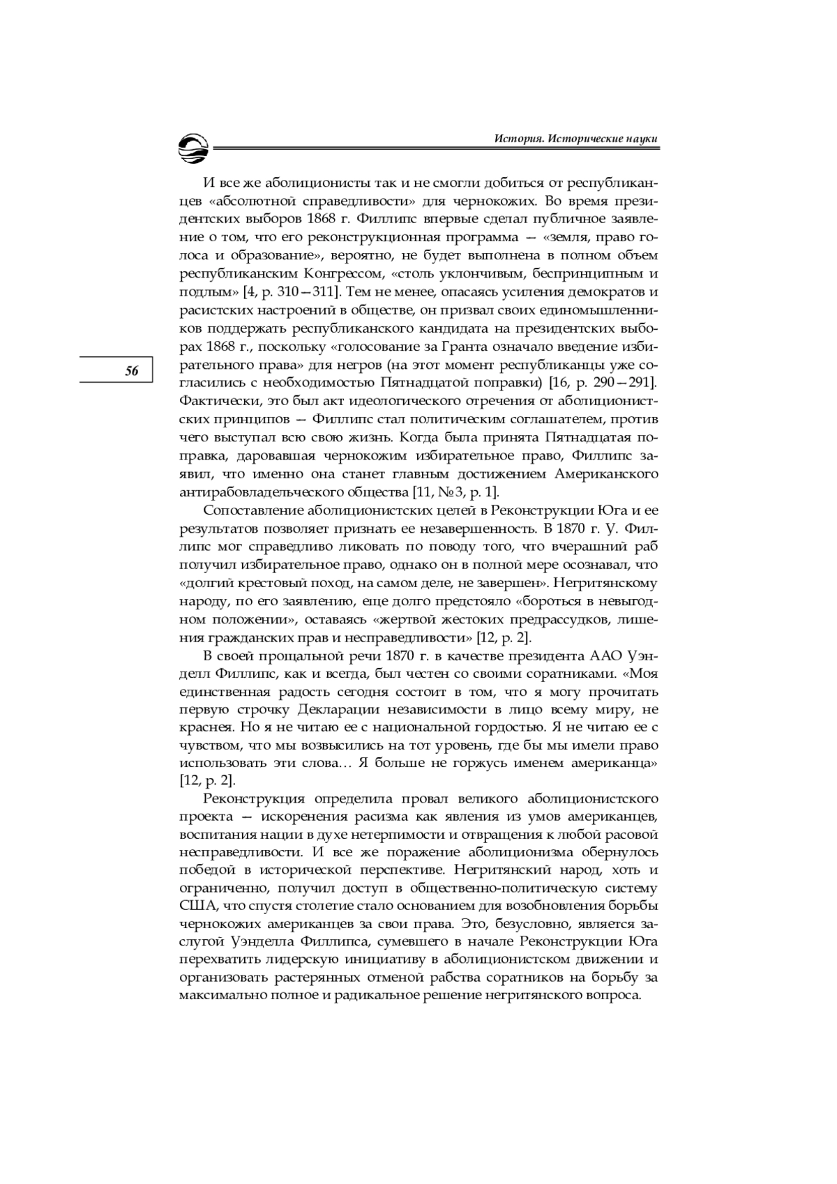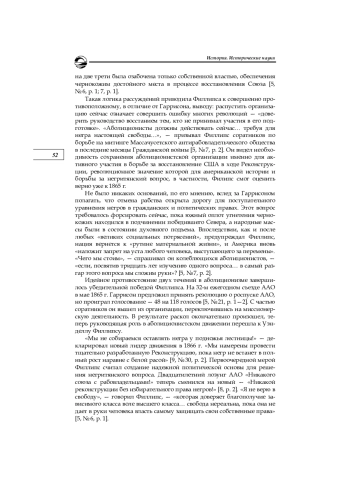Статья посвящена одной из центральных фигур аболиционистского движения в США Уэнделлу Филлипсу. Освещается его роль в организации аболиционистской борьбы в период Реконструкции Юга. Характеризуется позиция Филлипса в ходе раскола движения 1865 г.: внутриорганизационная борьба с курсом У. Л. Гаррисона и аргументация в пользу сохранения аболиционистской организации для решения негритянского вопроса как центрального в процессе восстановления единства Союза. Рассматривается реконструкционная программа Филлипса. Освещается его деятельность как лидера движения с 1865 по 1870 г.