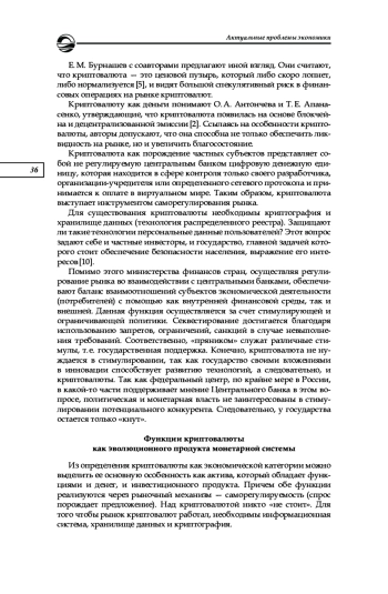 5. Бурнашева Е. М., Гольцов Д. Д., Хоченко А. А., Завалишина А. К. Криптовалюта: повторение кризиса или современное средство обмена? // Угрозы и риски финансовой безопасности в контексте цифровой трансформации: матер. VII междунар. науч.-практ. конф. Международного сетевого института в сфере ПОД/ФТ (Москва, 24 ноября 2021 года). М., 2021. С. 307-313. EDN: ZSJGWR