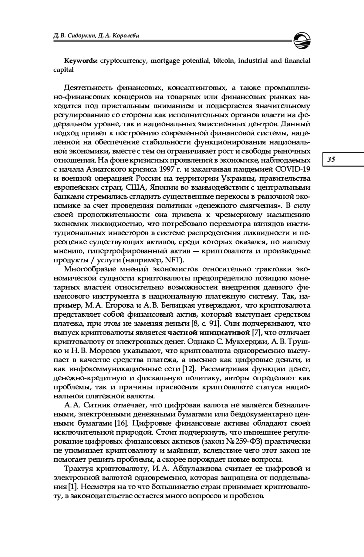 16. Ситник А. А. Цифровые валюты: проблемы правового регулирования // Актуальные проблемы российского права. 2020. Т. 15, № 11. С. 103-113. EDN: DVJDFY