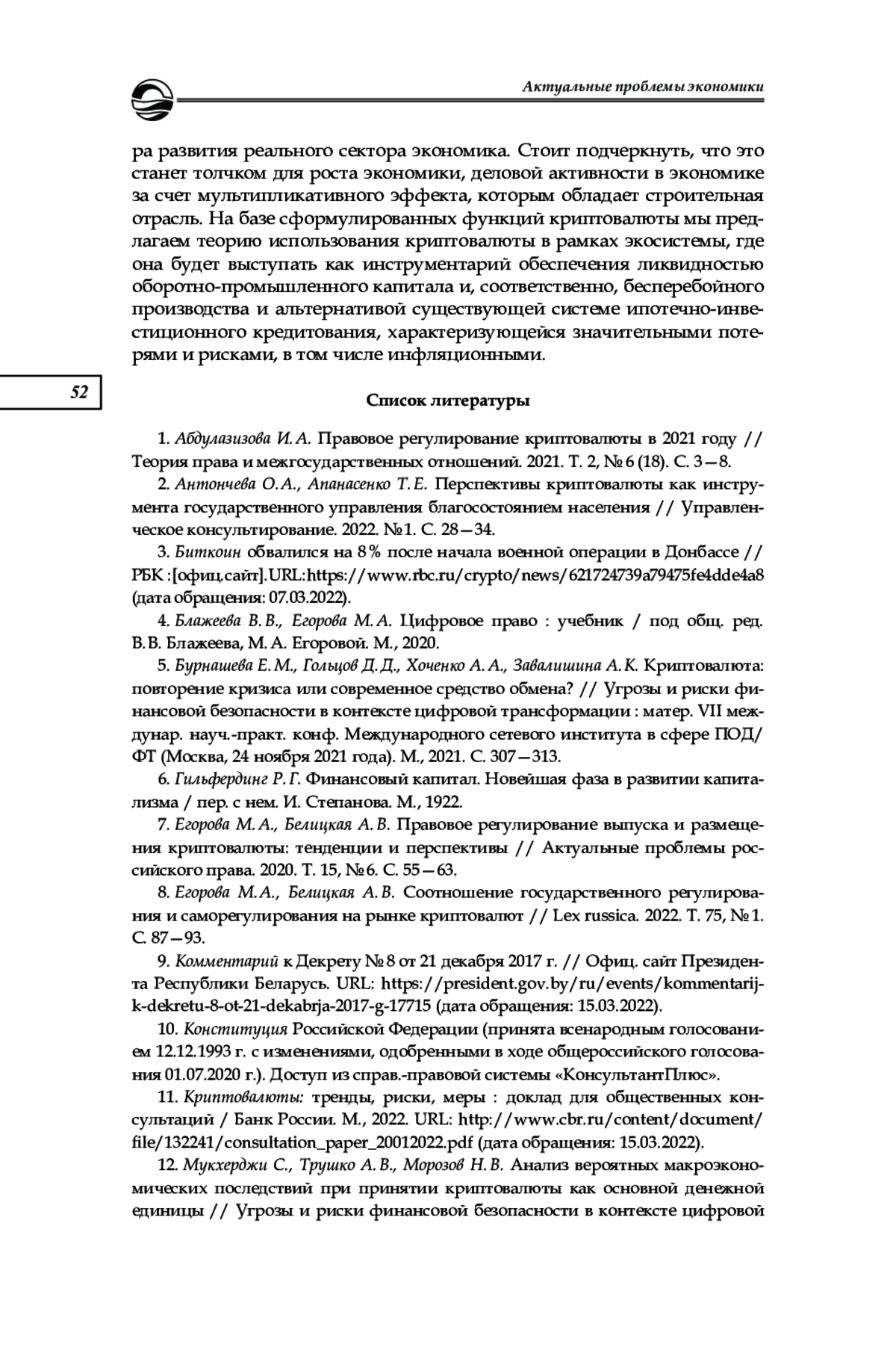 1. Абдулазизова И. А. Правовое регулирование криптовалюты в 2021 году // Теория права и межгосударственных отношений. 2021. Т. 2, № 6 (18). С. 3-8. EDN: HNRDMK