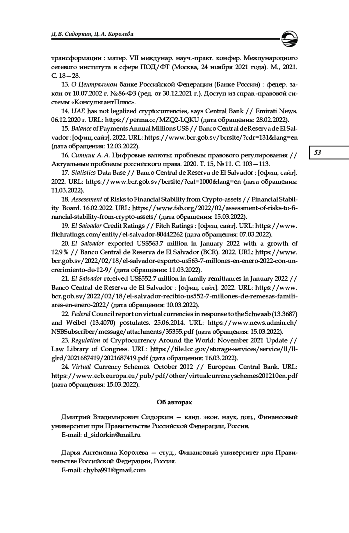 12. Мукхерджи С., Трушко А. В., Морозов Н. В. Анализ вероятных макроэкономических последствий при принятии криптовалюты как основной денежной единицы // Угрозы и риски финансовой безопасности в контексте цифровой трансформации: матер. VII междунар. науч.-практ. конфер. Международного сетевого института в сфере ПОД/ФТ (Москва, 24 ноября 2021 года). М., 2021. С. 18-28. EDN: VHRJLA