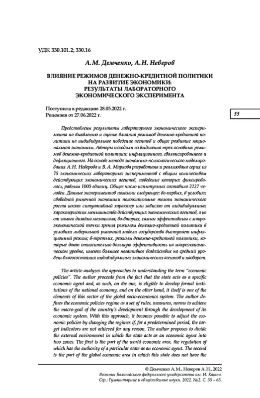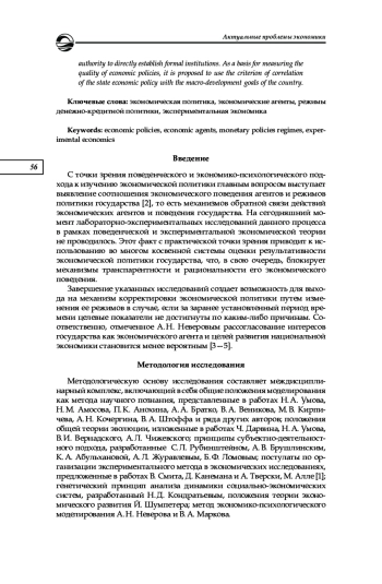 Представлены результаты лабораторного экономического эксперимента по выявлению и оценке влияния режимов денежно-кредитной политики на индивидуальное поведение агентов и общее развитие национальной экономики. Авторы исходили из выделения трех основных режимов денежно-кредитной политики: инфляционного, сбалансированного и дефляционного. На основе метода экономико-психологического моделирования А. Н. Неверова и В. А. Маркова разработана и реализована серия из 75 экономических лабораторных экспериментов с общим количеством действующих экономических агентов, поведение которых фиксировалось, равным 1005 единиц. Общее число испытуемых составило 2127 человек. Данные экспериментов показали следующее: во-первых, в условиях свободной рыночной экономики положительные темпы экономического роста носят ситуативный характер или зависят от индивидуальных характеристик меньшинства действующих экономических агентов, а не от самого дизайна механизма; во-вторых, самым эффективным с макроэкономической точки зрения режимом денежно-кредитной политики в условиях либеральной рыночной модели государства выступает инфляционный режим; в-третьих, режимы денежно-кредитной политики, которые дают относительно большую эффективность на макроэкономическом уровне, имеют большее негативное воздействие на средний уровень благосостояния индивидуальных экономических агентов и наоборот